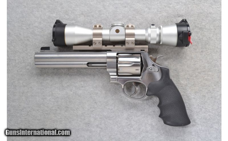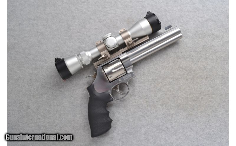 Description: This Smith & Wesson Model 629-6 Classic in Stainless Steel comes with a Leupold handgun scope and has a ported barrel. The original blue hard plastic Smith & Wesson case contains Owners Manual for both gun and scope. SOLD Caliber Info: .44 Magnum Chambers: 6 shot. Metal Condition: Very good. Light cylinder drag. Bore Condition: Excellent. Barrels: 6.5 inch stainless steel. Top of barrel is ported. Triggers: Single Action / Double Action Stock: Hogue textured black rubber grip with finger grooves. Weight: 4 lbs. 5 oz. with scope mounted. Sights: Leupold VX-III 2.5-8X32mm Handgun Scope. Raised blade front. Item Location: Richfield, WI |