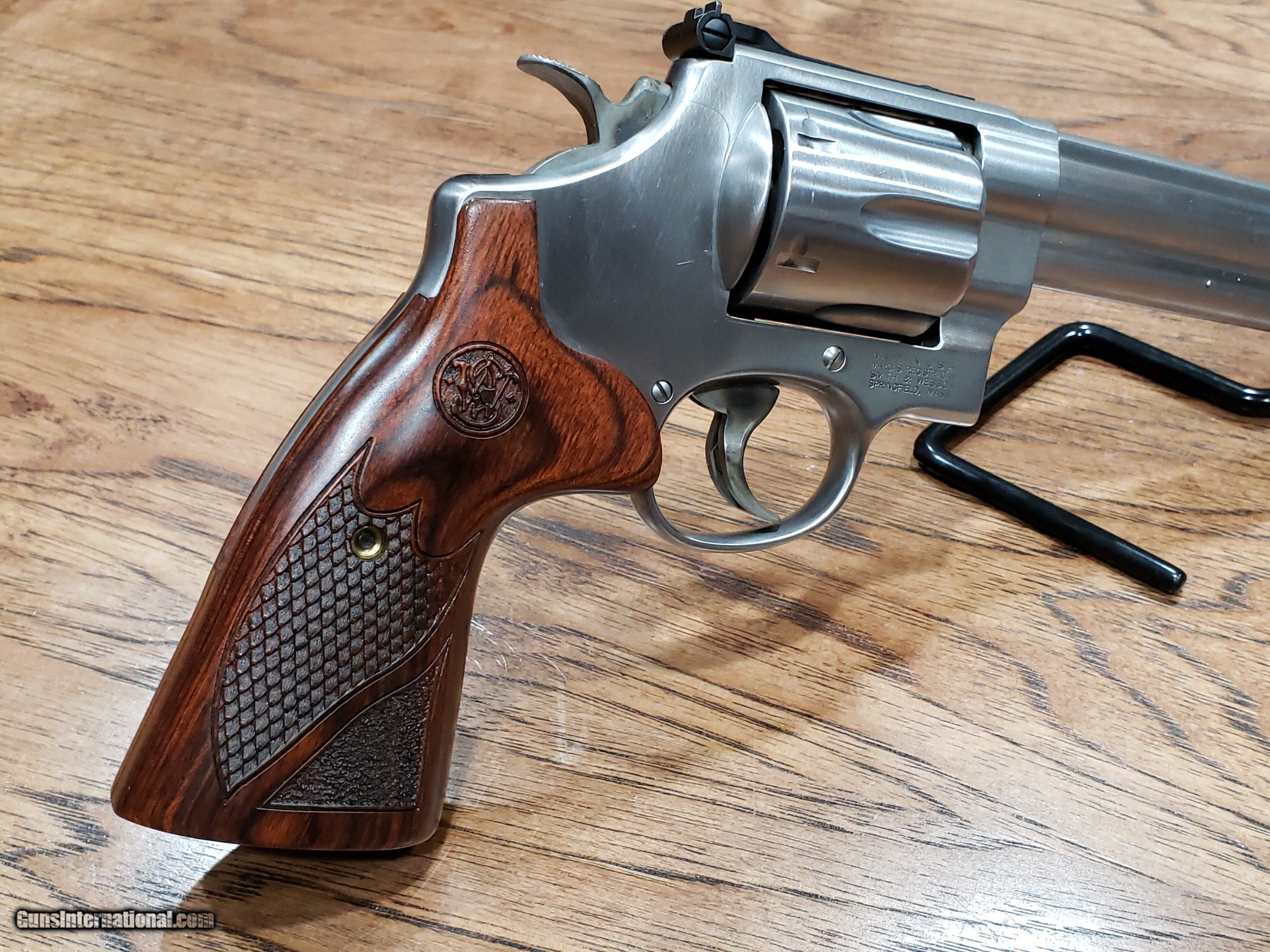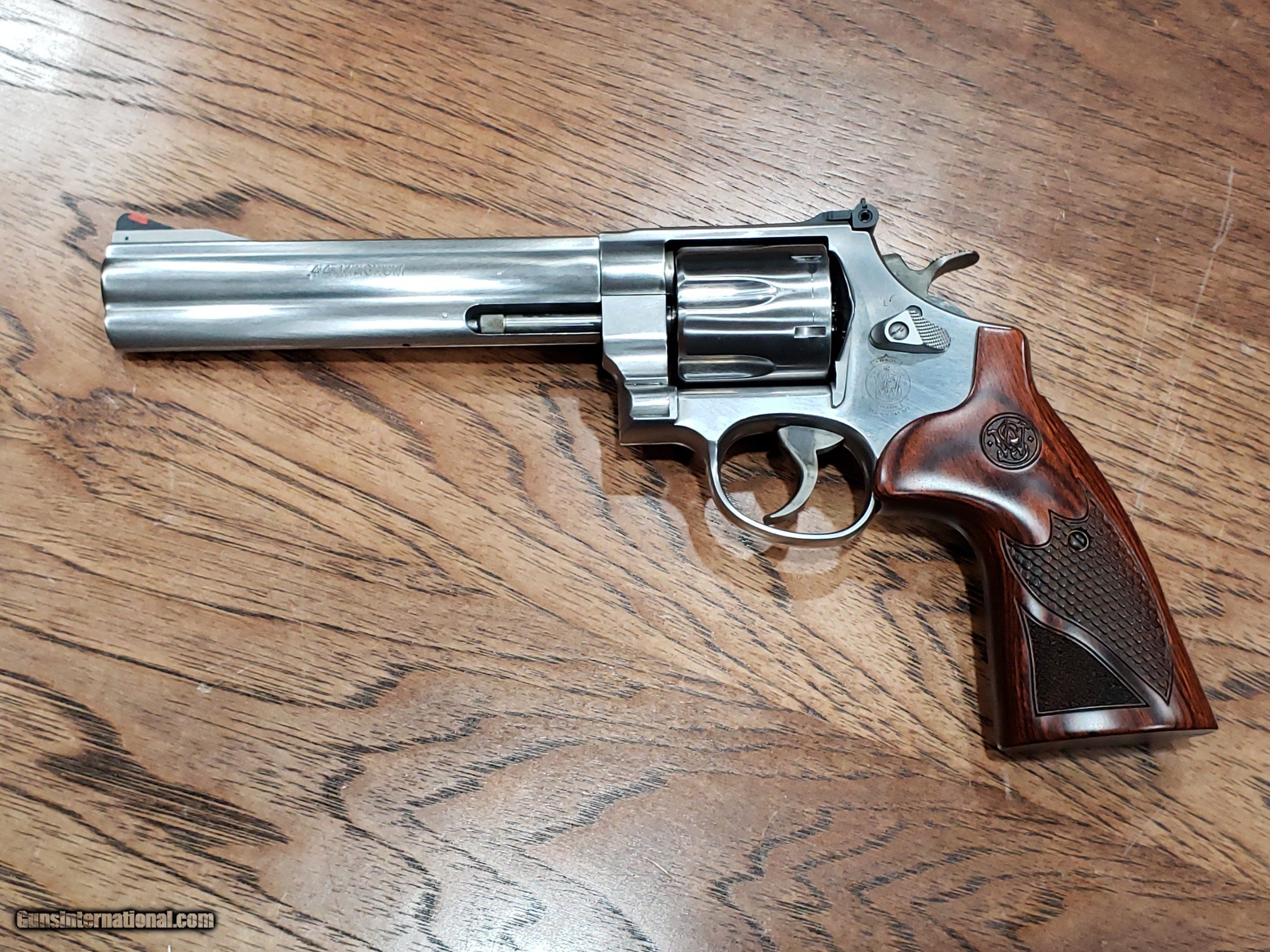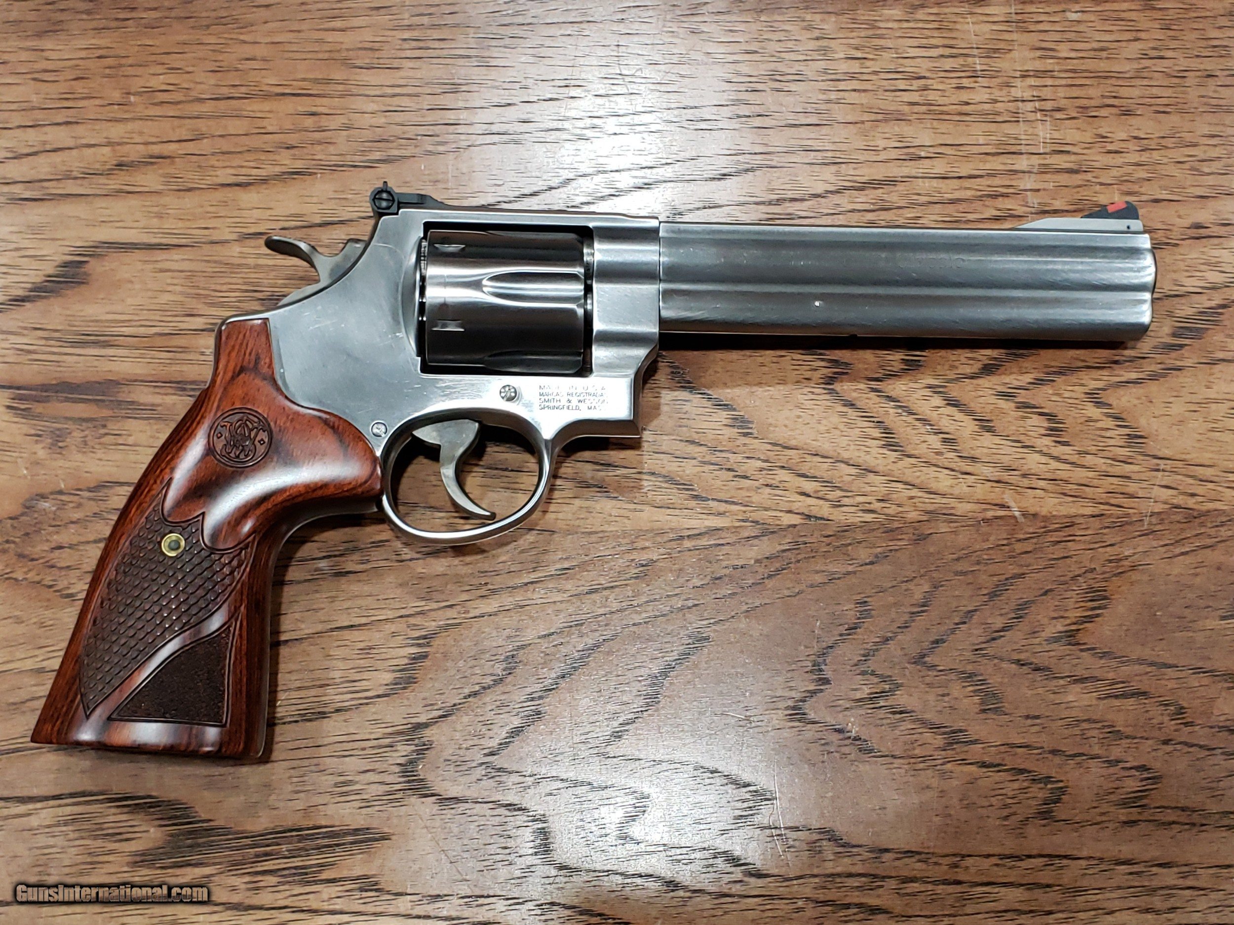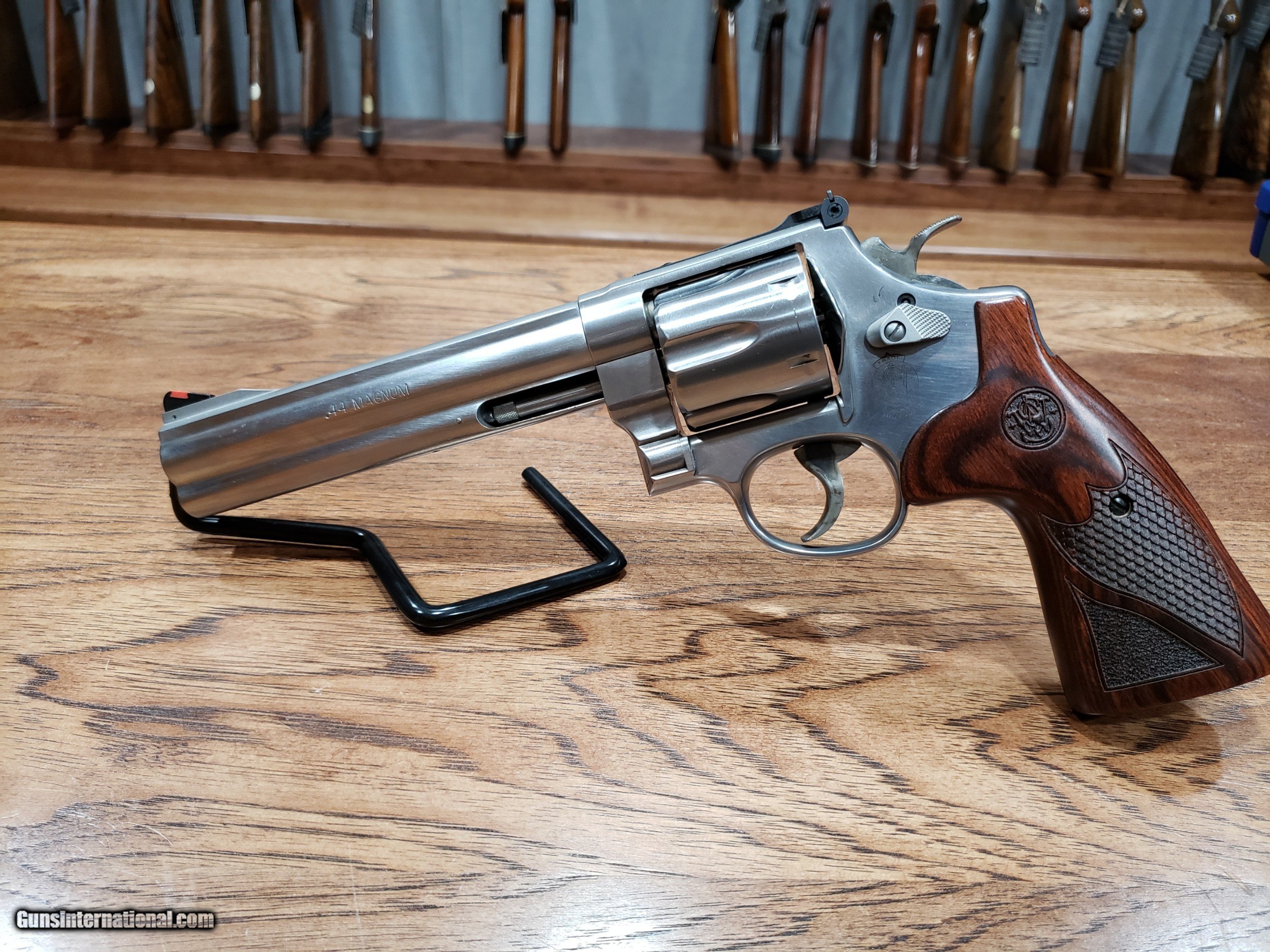 Description: Smith & Wesson 629-6 Stainless 44 Magnum Revolver 6.5" Lightly used S&W 629-6 chambered in .44 Mag with a 6-1/2" barrel, stainless finish, and wood grips. The bore is bright and shiny with distinct rifling. Cylinder has a very faint turn line and locks up tight. Action is crisp and smooth. Grips are excellent. The stainless finish looks great and only has a few tiny, light scratches. Included with the gun: original S&W plastic case, lock, owner's manual, factory test-fire casing, keys for hammer lock, and various literature.
