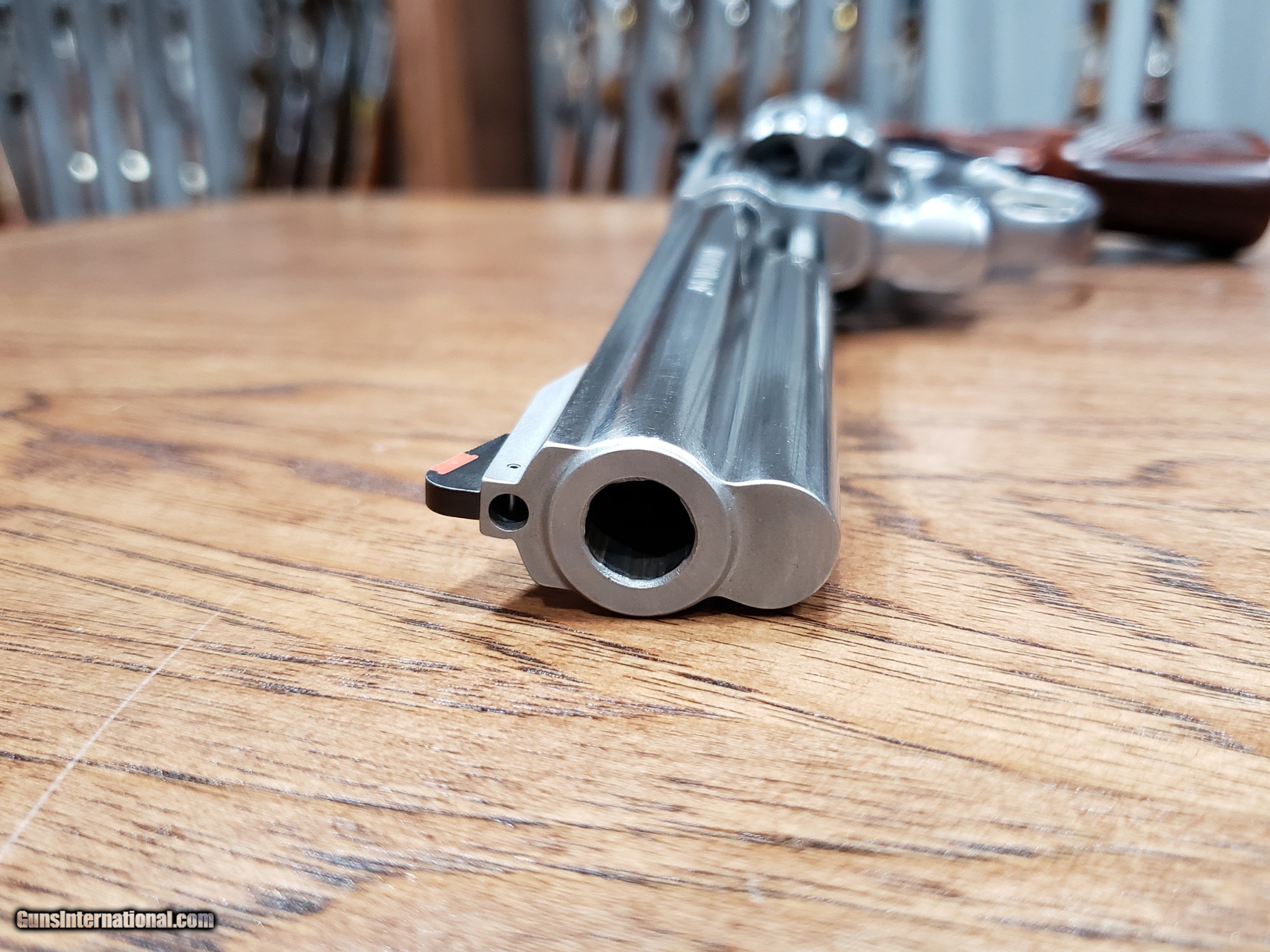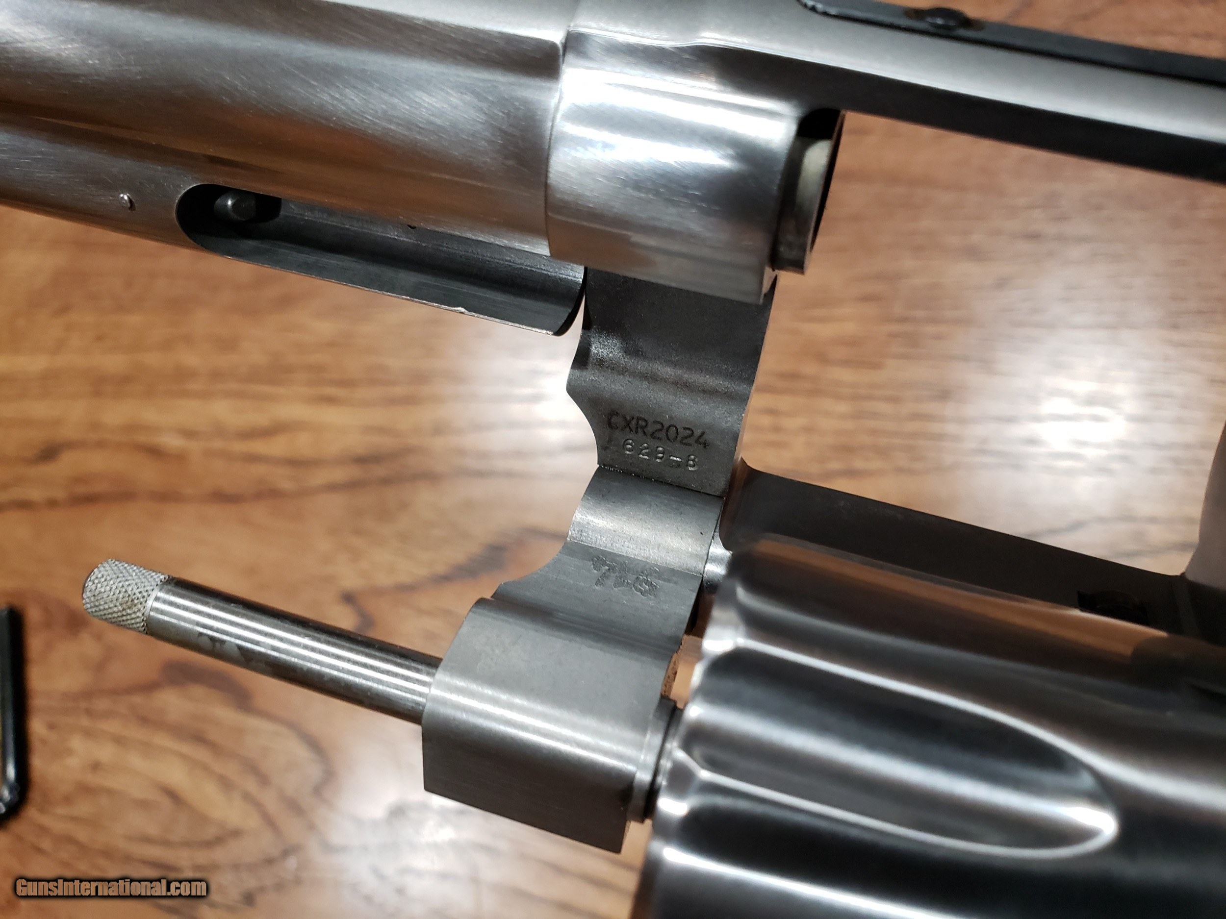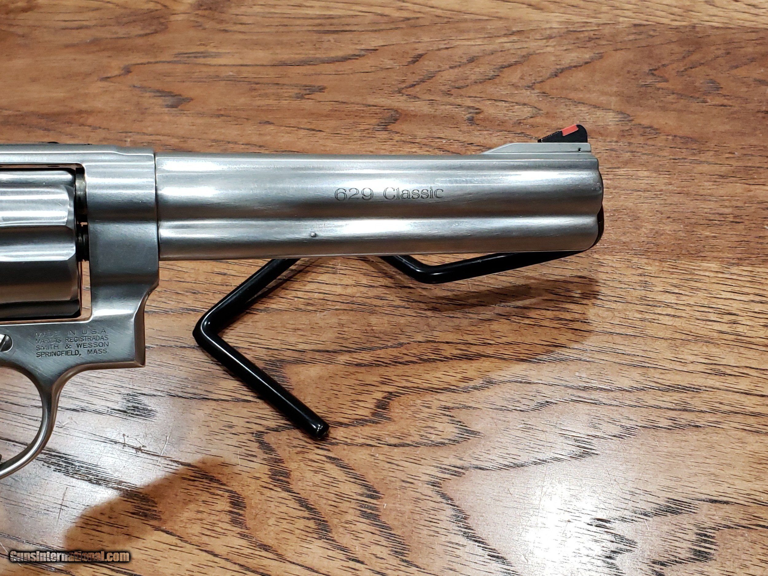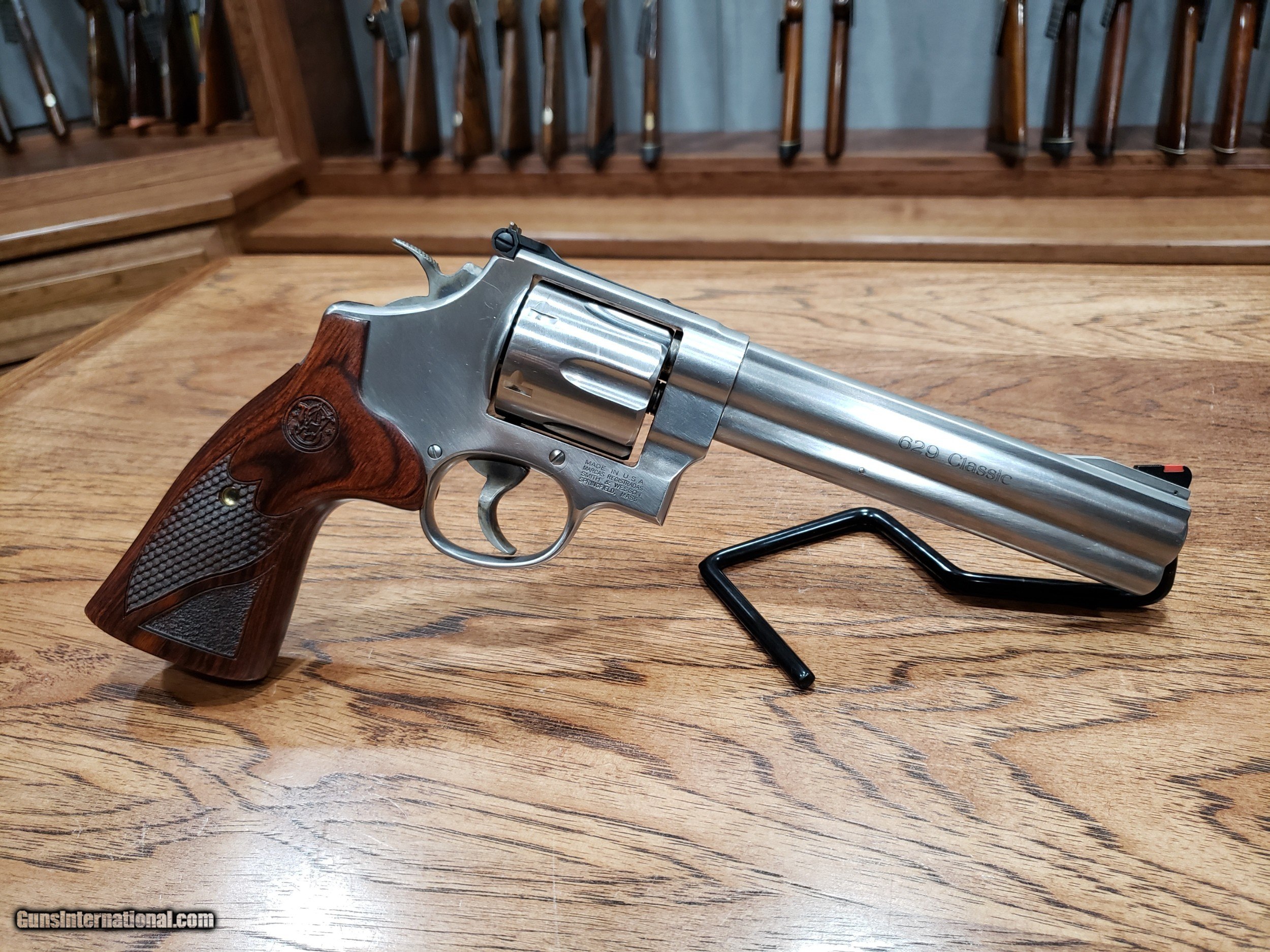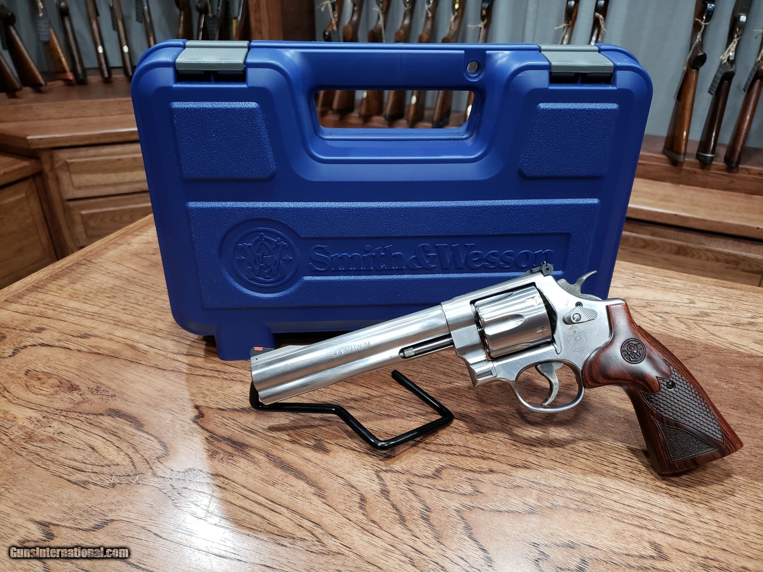 Description: Smith & Wesson 629-6 Stainless 44 Magnum Revolver 6.5" Lightly used S&W 629-6 chambered in .44 Mag with a 6-1/2" barrel, stainless finish, and wood grips. The bore is bright and shiny with distinct rifling. Cylinder has a very faint turn line and locks up tight. Action is crisp and smooth. Grips are excellent. The stainless finish looks great and only has a few tiny, light scratches. Included with the gun: original S&W plastic case, lock, owner's manual, factory test-fire casing, keys for hammer lock, and various literature.