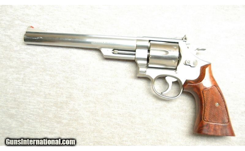 Description: Smith & Wesson Model 629-1 in .44 Magnum. This .44 Magnum has a six shot fluted cylinder and remains in overall excellent condition. Cylinder has very light turn ring. Grips are also excellent. The powerful .44 Magnum makes an excellent hunting cartridge effective for all North American large game. .44 Magnum SOLD Chambers: .44 Magnum Metal Condition: Excellent Wood Condition: Excellent Bore Condition: Bright Barrels: 8 1/4 Inch Barrel Triggers: Double and single action Butt Pad: Checkered Walnut Grips with S&W Medallion Sights: Front ramp with red insert and rear adjustable sight Item Location: La Vista, NE |