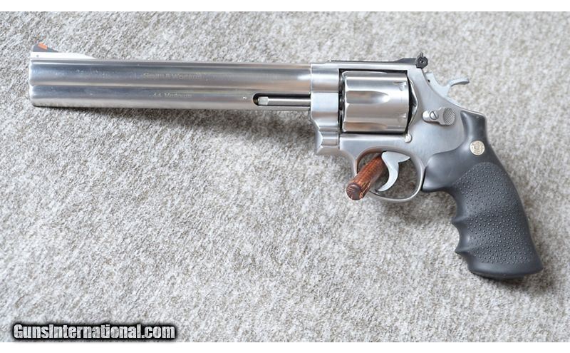 Description: The Smith & Wesson Model 629 Classic Double-Action Revolver is a serious big game hunting handgun, capable of taking large species, with the hard-hitting .44 magnum cartridge. The overall weight of the N-Frame revolver tames the recoil to a very manageable level in relation to the gun's power. The single-action trigger pull on the 629 is light and crisp for precise shooting; the double-action pull cycles the cylinder smoothly for rapid fire. A large, aggressively checkered exposed hammer provides a solid non-slip surface to cock the hammer under inclement conditions. The red-ramp front sight is pinned into an integral sight ramp, and the rear sight has a white outline and is adjustable for windage and elevation. Stainless steel construction provides corrosion resistance and low maintenance for prolonged holster carry while camping and hiking in the backcountry. The synthetic rubber grip provides a sure hold in any weather, and helps to absorb recoil. The Smith & Wesson Model 629 Double-Action Revolver handles smoothly, with a superb balance of accuracy and power. This is a versatile revolver for hunting, home defense, and target shooting. Made in USA. This Model 629 Classic is in almost new condition with a very faint cylinder drag mark. .44 Remington Magnum SOLD Metal Condition: Excellent Bore Condition: Excellent Barrels: 8 3/8 Weight: 3.5 lbs Sights: Adjustable rear sight and front red ramp sight Item Location: Boise, ID |