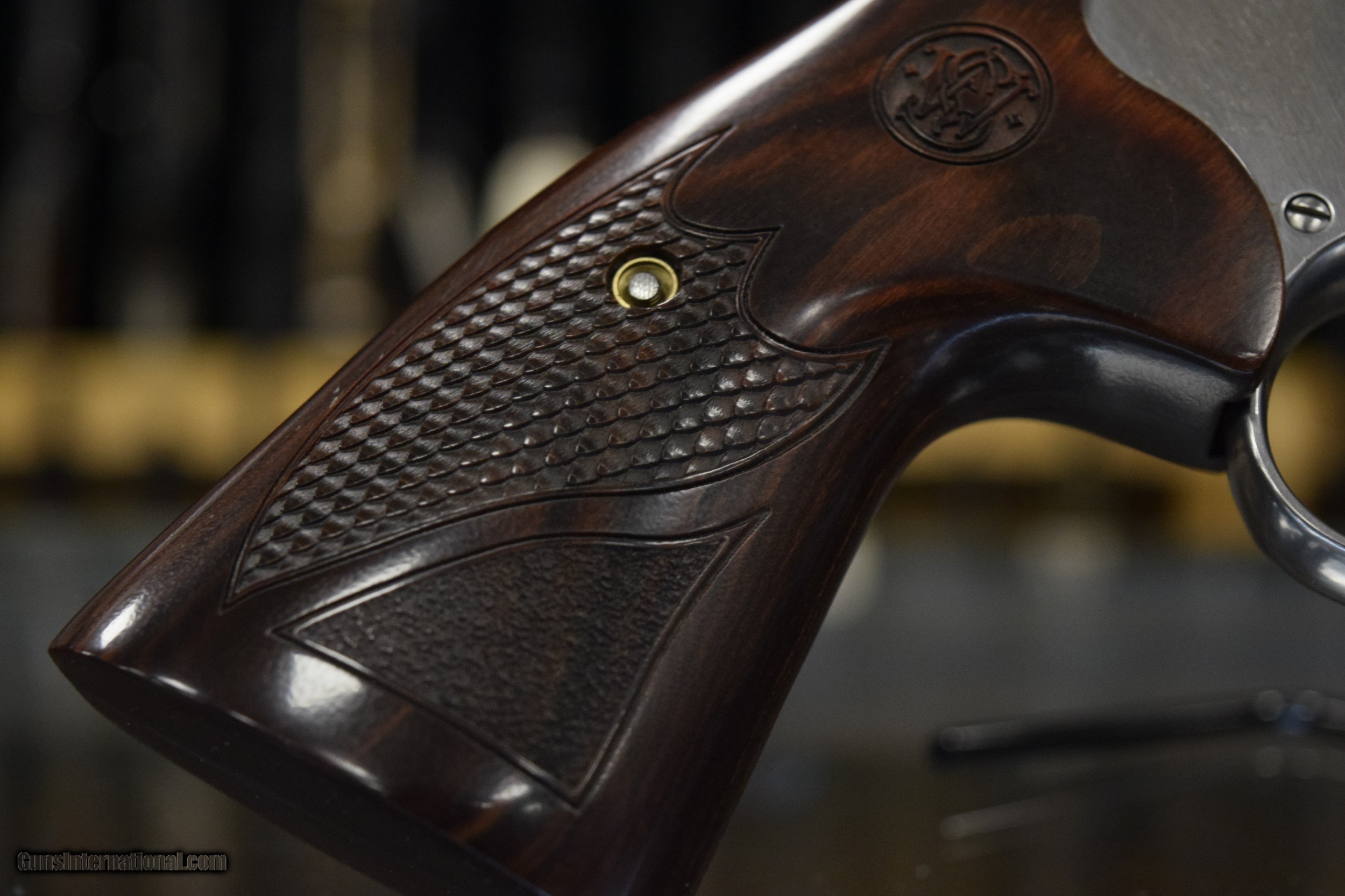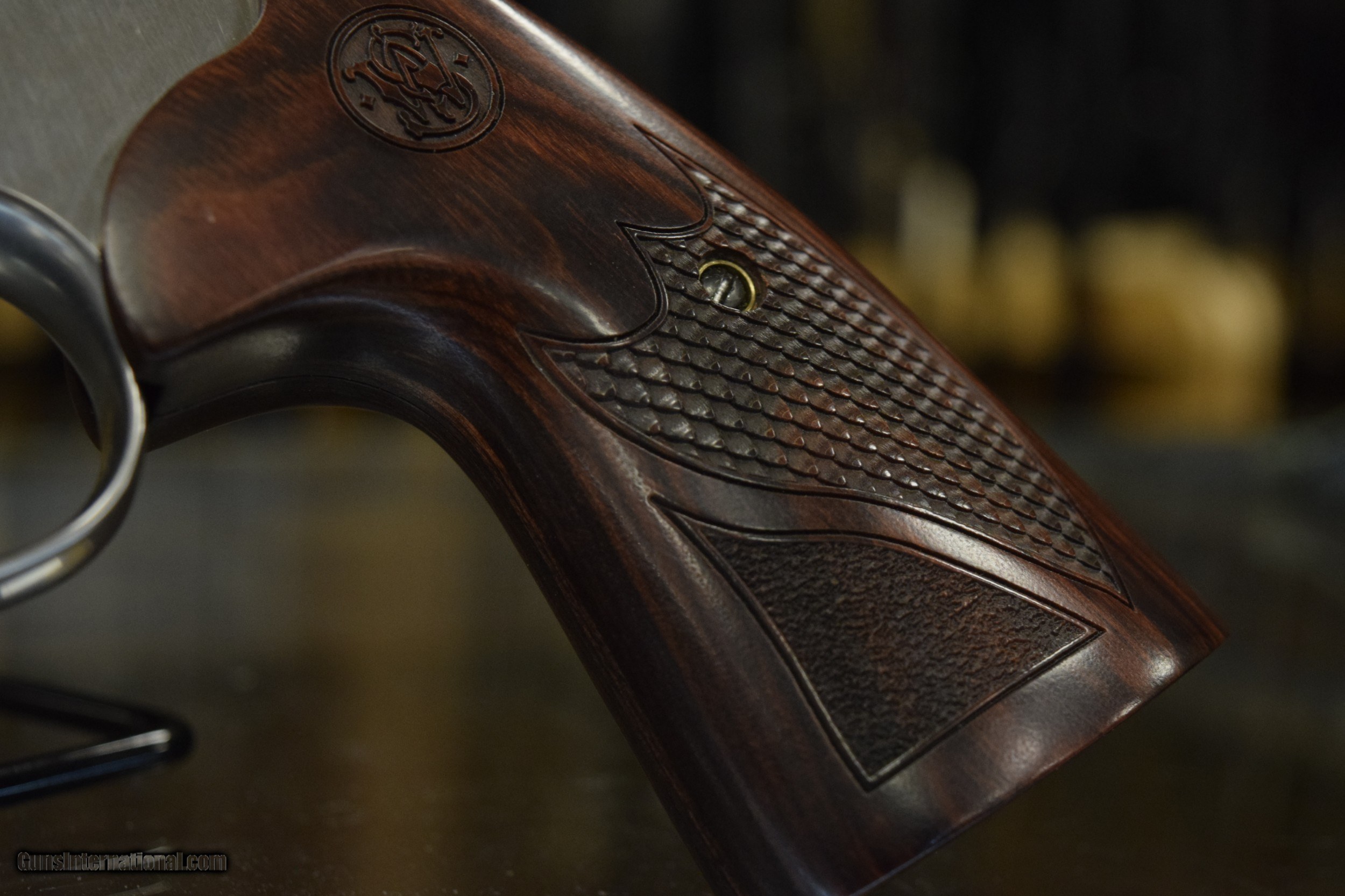Description: Smith & Wesson leads the way when it comes to the most powerful revolvers. The Model 629 Deluxe chambered in .44 Magnum, features elegant textured wood grips. The all stainless steel Model 629 Deluxe offers compact powerful protection, sport shooting, handgun hunting and collecting all in one. This item is in excellent condition. It comes with the original case. Smith & Wesson Model 629-4 .44 Magnum 8-3/8'' Revolver