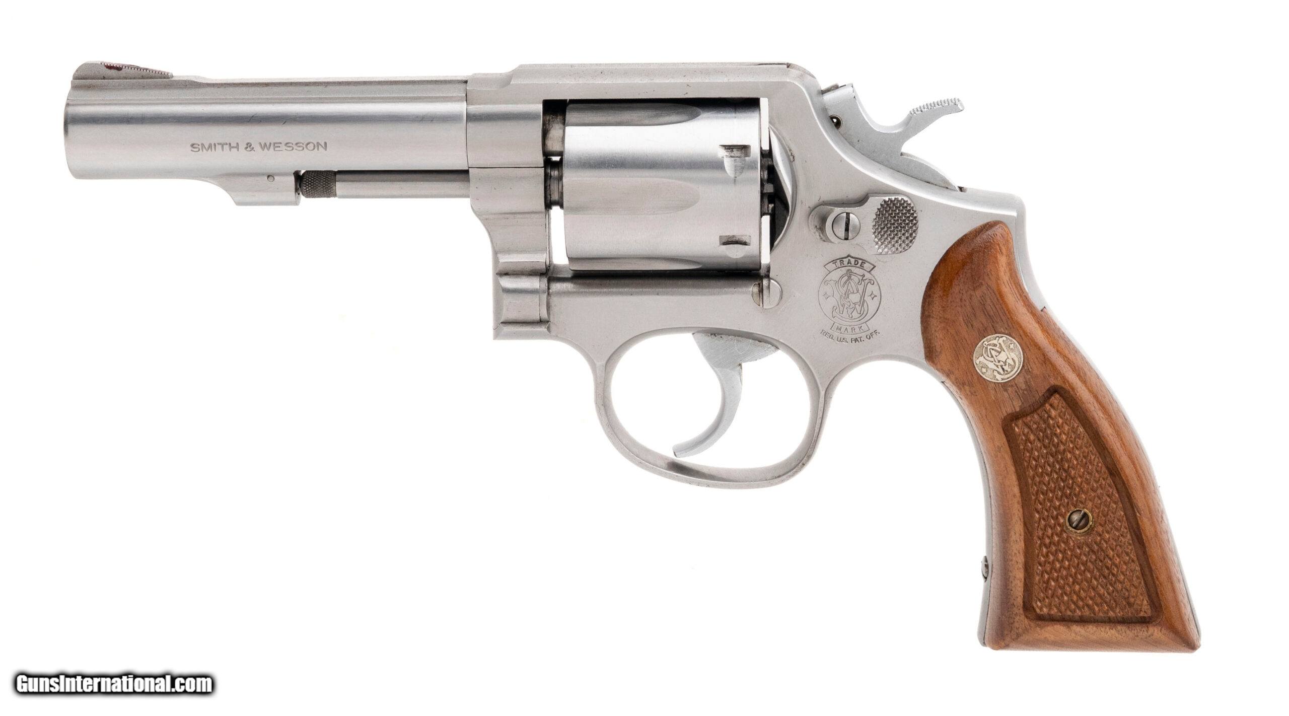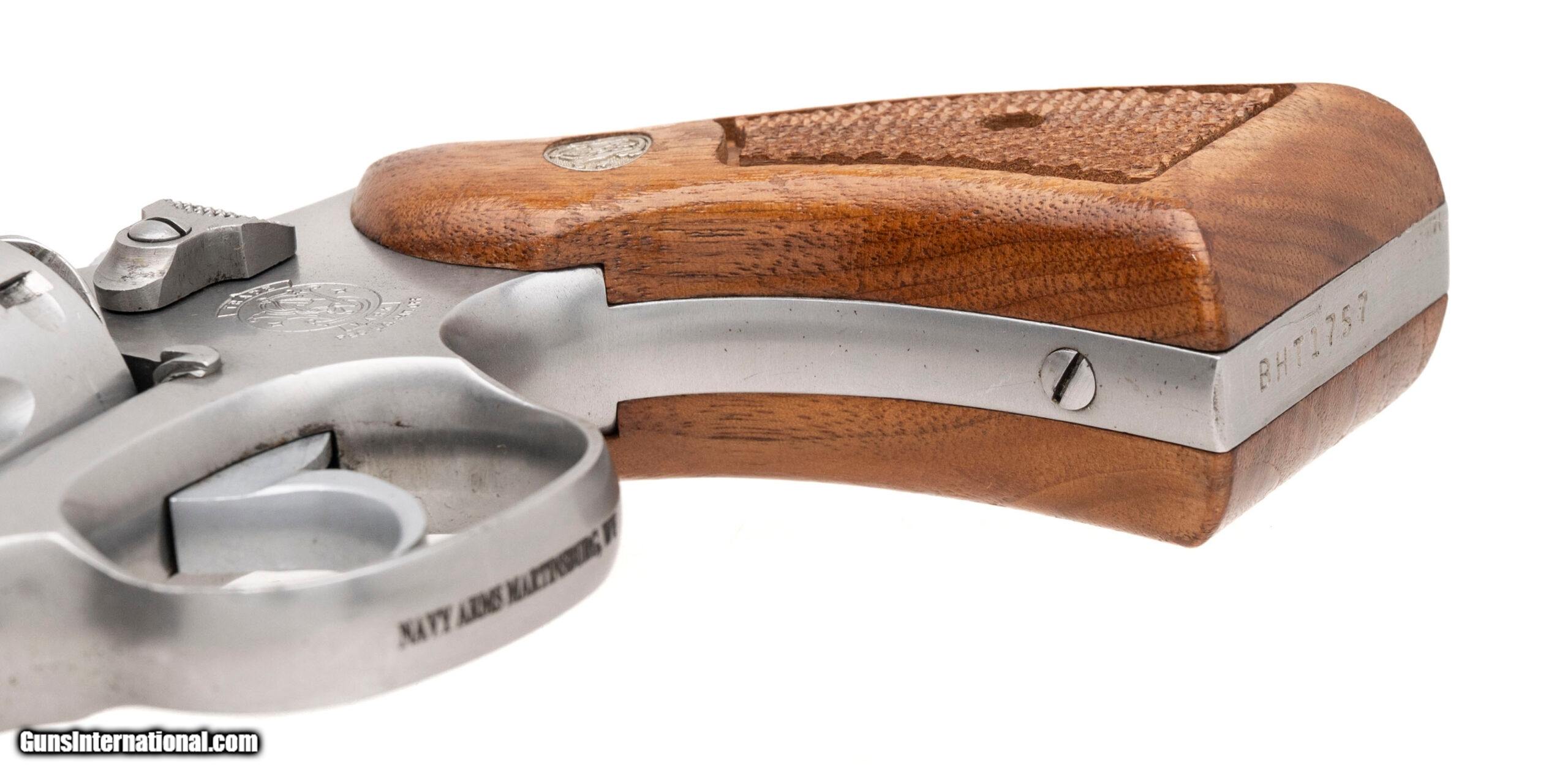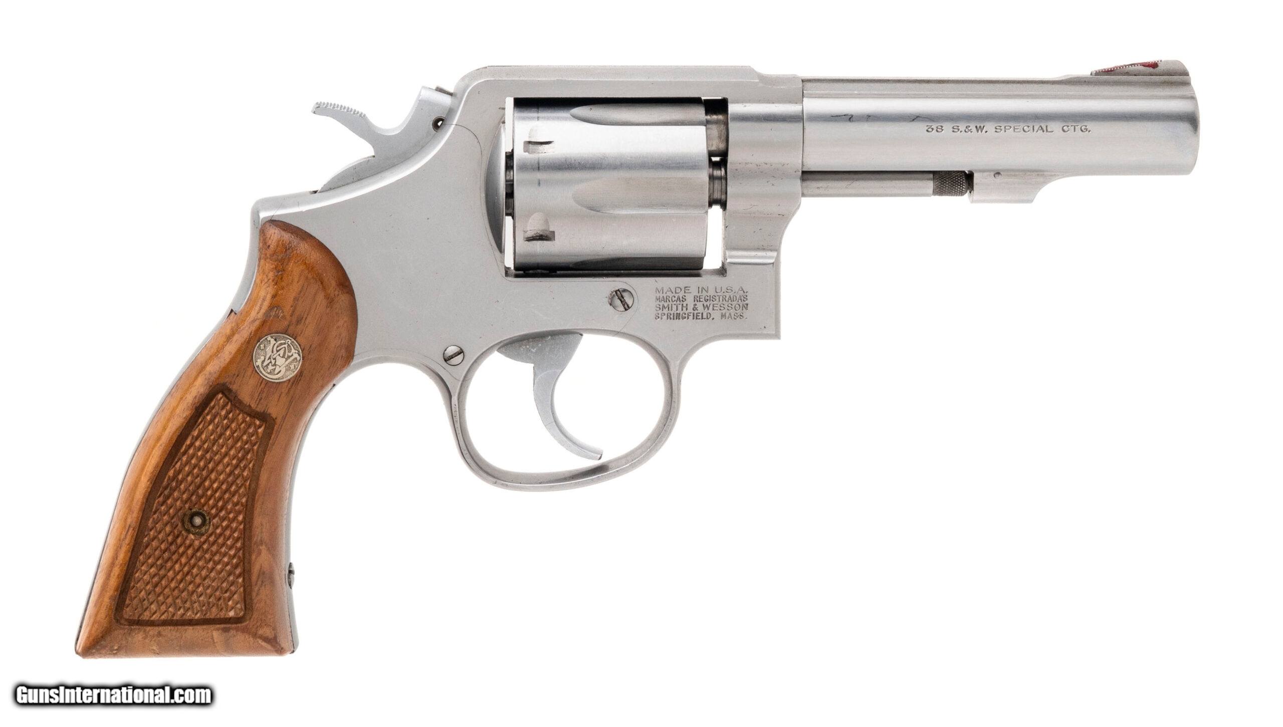 Description: "SN: BHT1757. 1980s vintage, .38 S&W special with a 4"" barrel. Bore is excellent. Imported double-action stainless K-frame revolver from the Queensland P.D. with Australian proof marks, and square butt checkered medallion wood grips. Finish shows moderate handling wear. Overall condition is very good. SOLD |