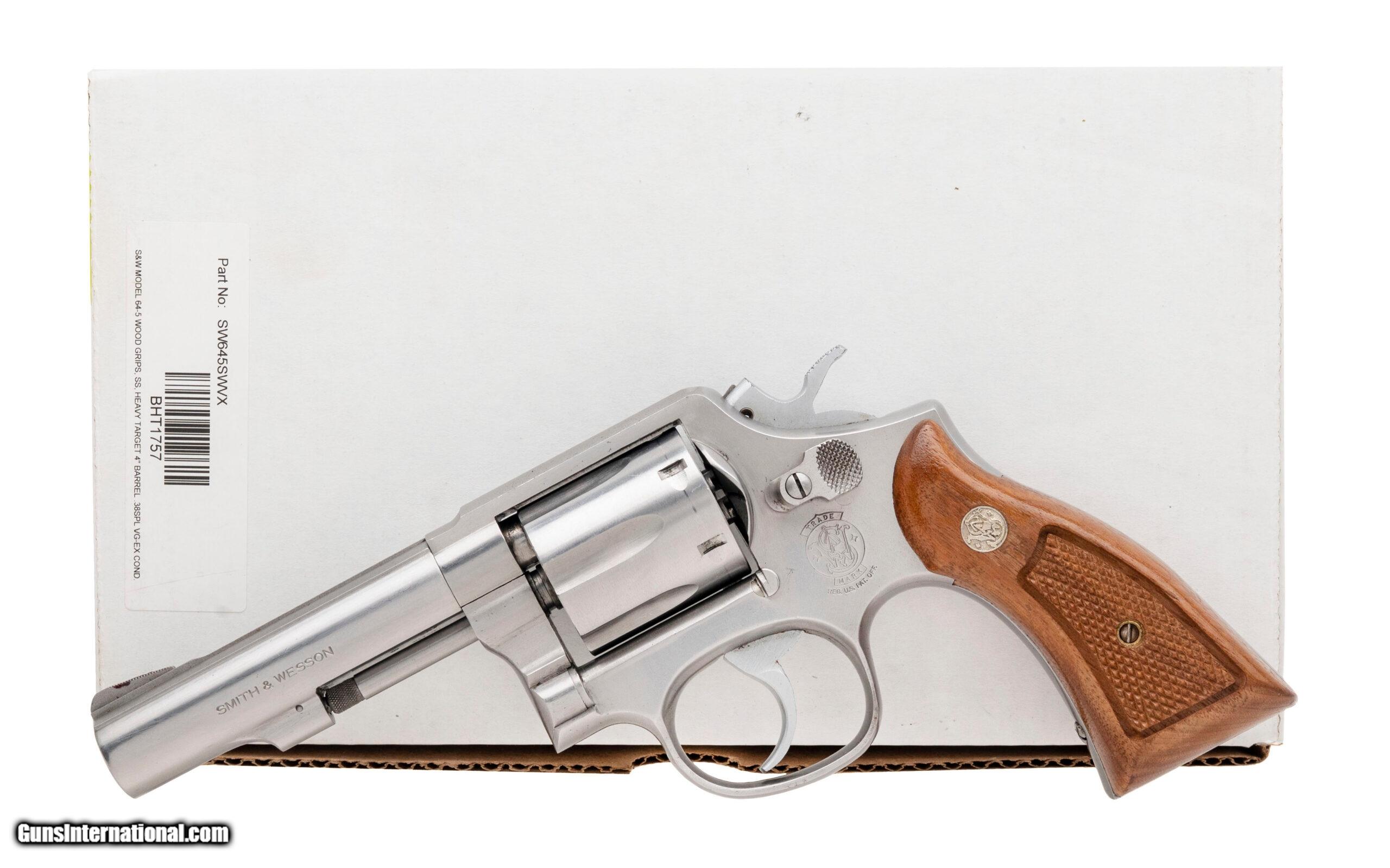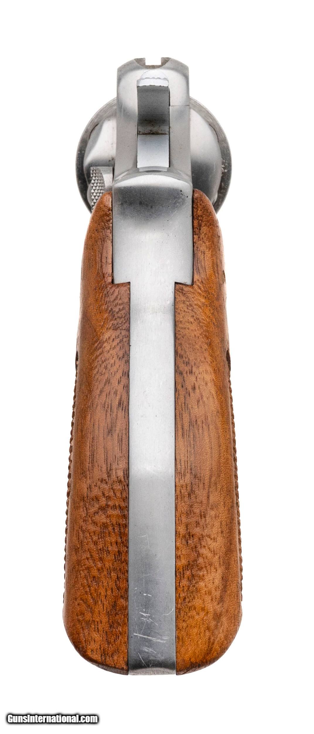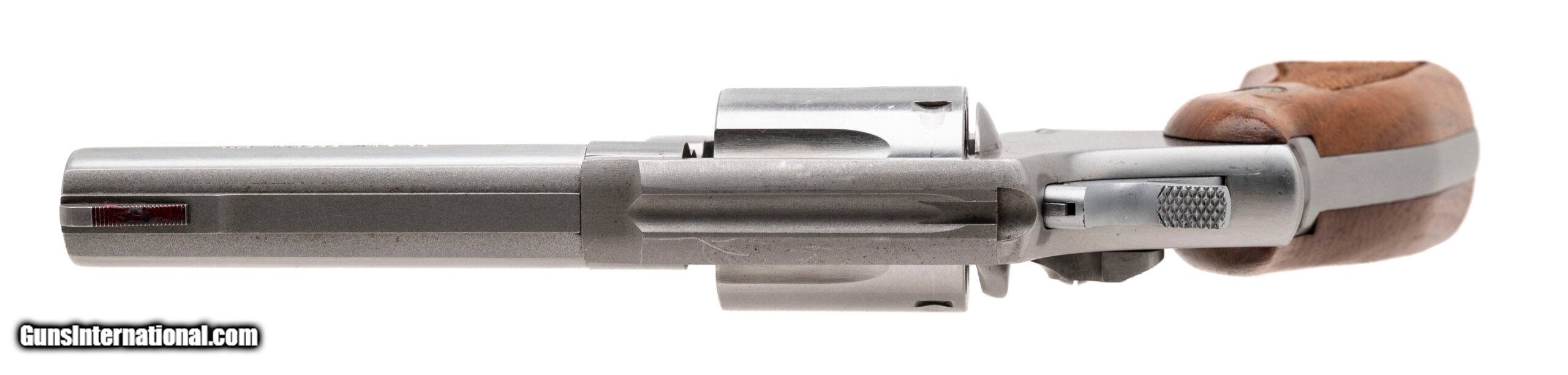 Description: "SN: BHT1757. 1980s vintage, .38 S&W special with a 4"" barrel. Bore is excellent. Imported double-action stainless K-frame revolver from the Queensland P.D. with Australian proof marks, and square butt checkered medallion wood grips. Finish shows moderate handling wear. Overall condition is very good. SOLD |