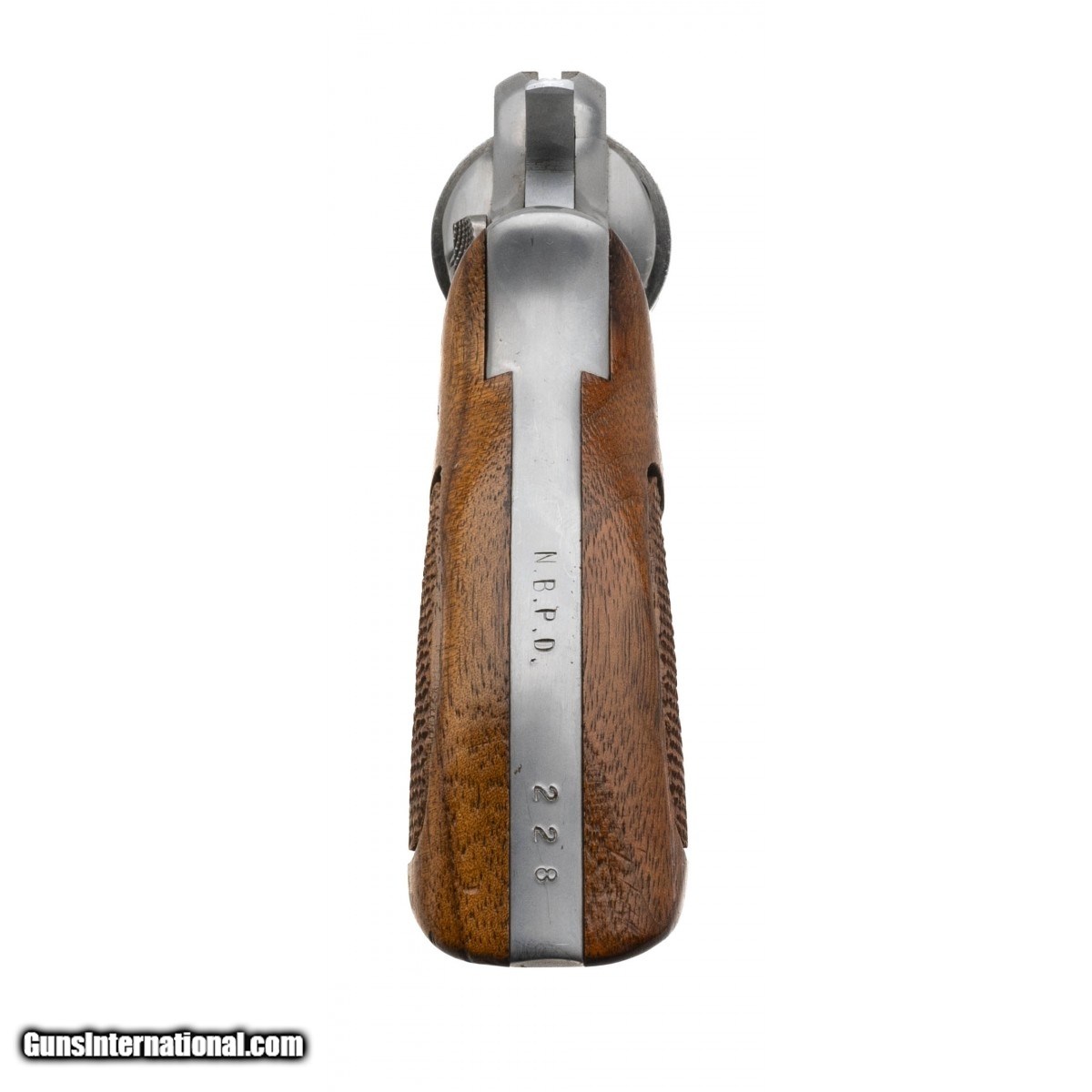 Description: " SN:D798067. Made circa 1980's. .38 Special with a 4"" barrel Pined barrel. Bore is in excellent condition. Vintage'80 Police Revolver. Finish and grips are in very good condition with wear noted on frame and grips. Revolver is engraved N.B.P.D 228 on back of grips. Overall condition is very good. SOLD |