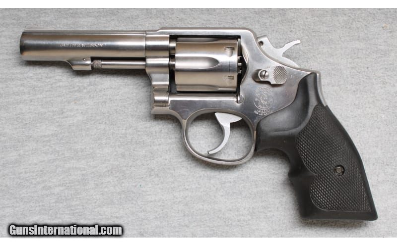 Description: Very good condition, some finish wear, small nicks and scratches. 6 Shot stainless finish revolver with 4" heavy barrel, double and single action trigger, fixed sights and hard rubber grips. .38 Special SOLD Chambers: Revolver Metal Condition: Very good Bore Condition: Bright Barrels: 4 Triggers: Double and single action Butt Pad: Hard rubber grips Item Location: La Vista, NE |