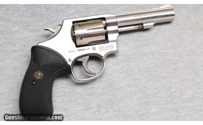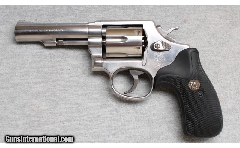 Description: Very good, some finish wear, small nicks and scratches. 6 Shot .38 caliber revolver, 4" heavy barrel, stainless finish, Pachmayr hard rubber grips. A good choice for target practice or for home defense. .38 Special SOLD Chambers: Revolver Metal Condition: Very good Bore Condition: Bright Barrels: 4 Triggers: Double and single action Butt Pad: Pachmayr grips Sights: Fixed sight channel Item Location: La Vista, NE |