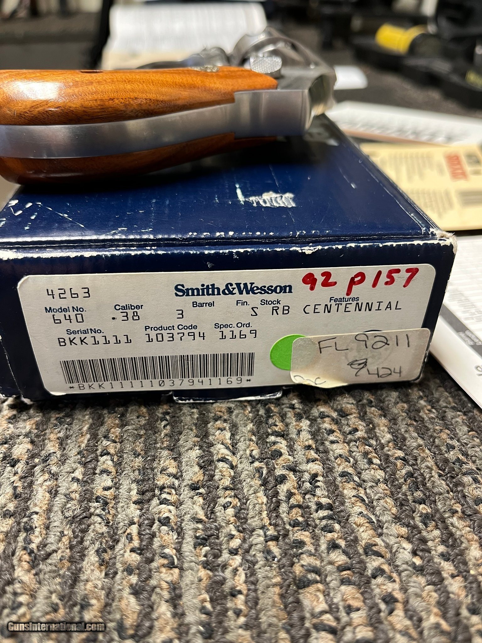 Description: Guns Listing ID: 556037 Outstanding Smith & Wesson model 640 38 spl revolver. 5 shot 3" barrel. In factory box and appears unfired. Has manual, tools and everything. Can’t get any better than this one ! SOLD Manufacturer: SMITH & WESSON Model: 640 Caliber Info: .38 SPL Condition: Used - Non-Certified Barrels: 3 BARREL Action: REVOLVER Finish: stainless |