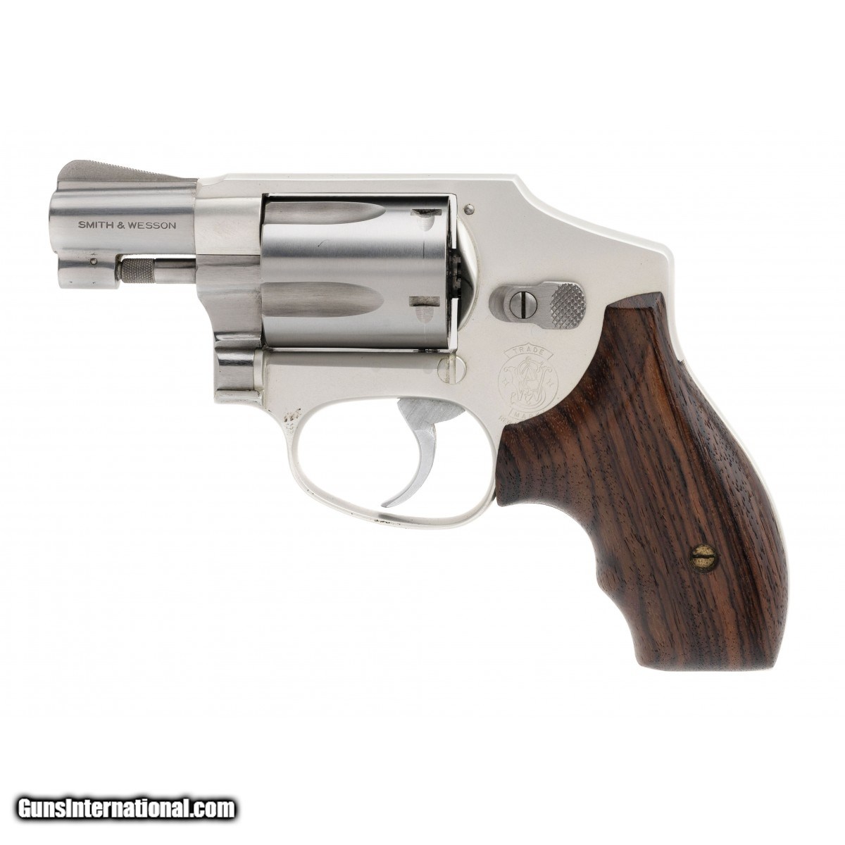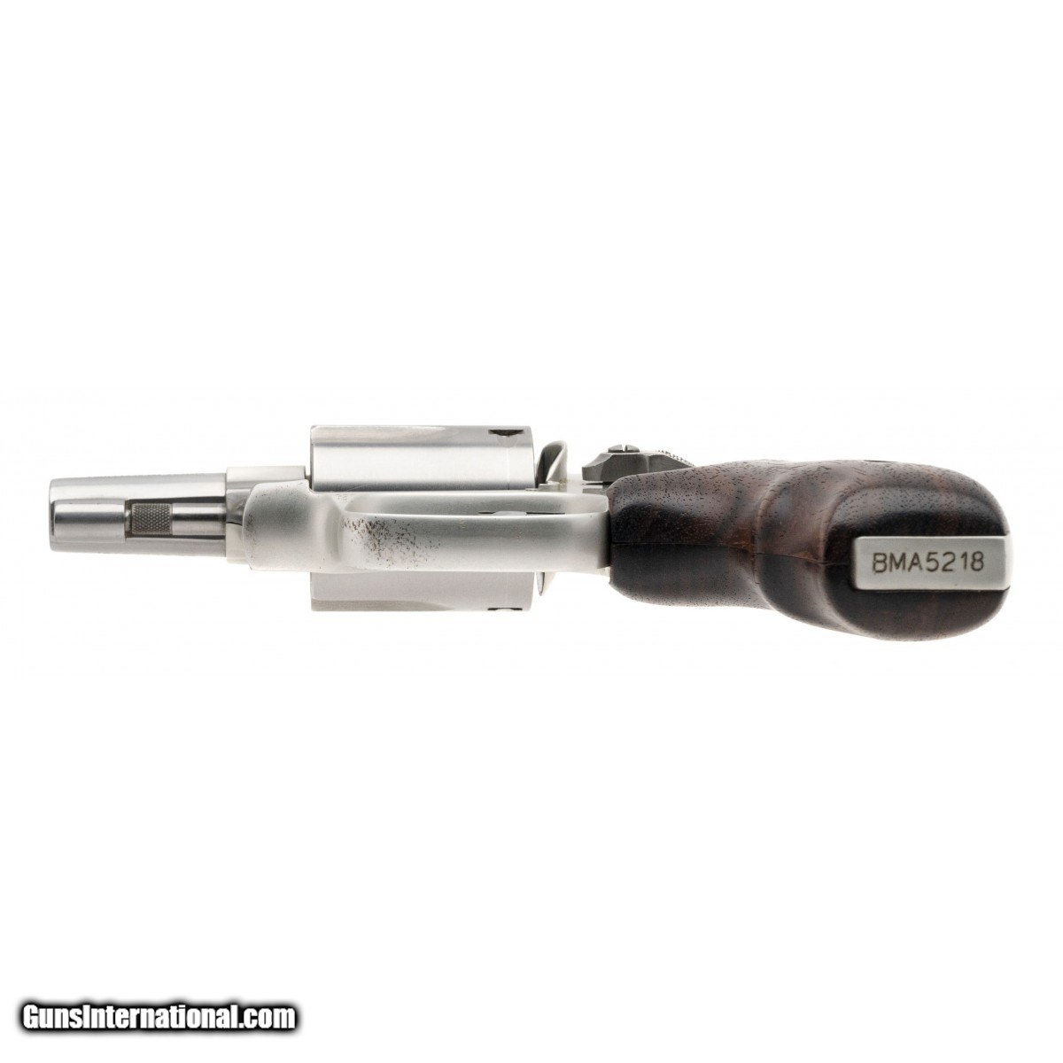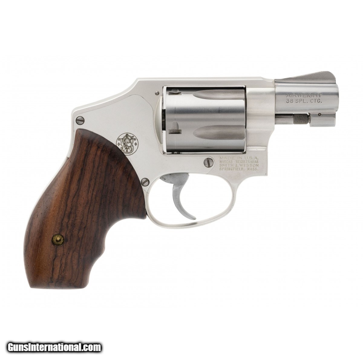 SN: BMA5218. 1990's vintage .38 Special with a 2"" barrel. Stainless steel Airweight J-frame snubnose revolver. Has custom wood grips. Shows light wear, overall very good condition.