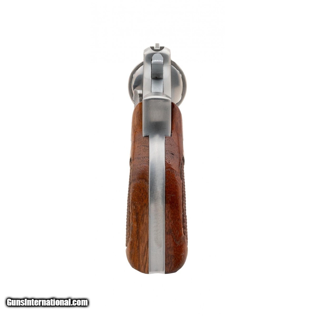 Description: " SN: 7D95101. Made in 1981. .357 Magnum with a 4"" barrel. Bore is excellent. Revolver with stainless steel finish and checkered wood grips. Minor chip on palm of right grip. Overall very good condition. SOLD |