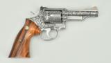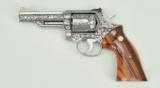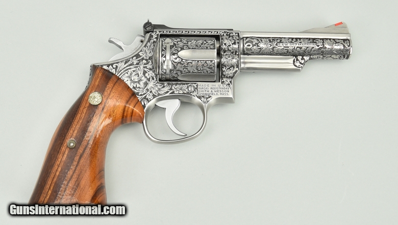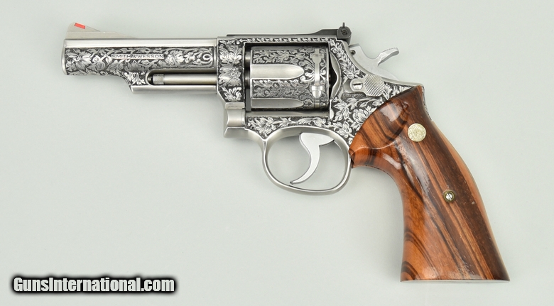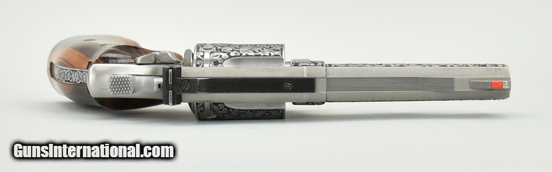 Smith & Wesson 66 .357 Magnum caliber revolver. Custom engraved 4” 66 no dash, 1970’s vintage. Has pinned barrel, recessed cylinder, and smooth rosewood presentation grips. Has about 90% coverage foliate scroll. A beautiful piece in excellent condition.