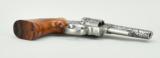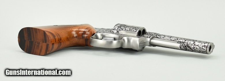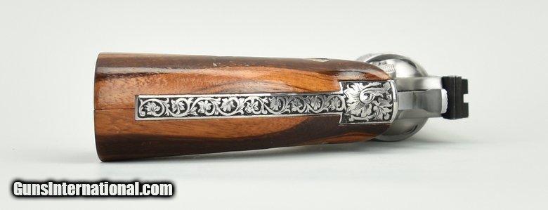 Description: Smith & Wesson 66 .357 Magnum caliber revolver. Custom engraved 4” 66 no dash, 1970’s vintage. Has pinned barrel, recessed cylinder, and smooth rosewood presentation grips. Has about 90% coverage foliate scroll. A beautiful piece in excellent condition. SOLD |