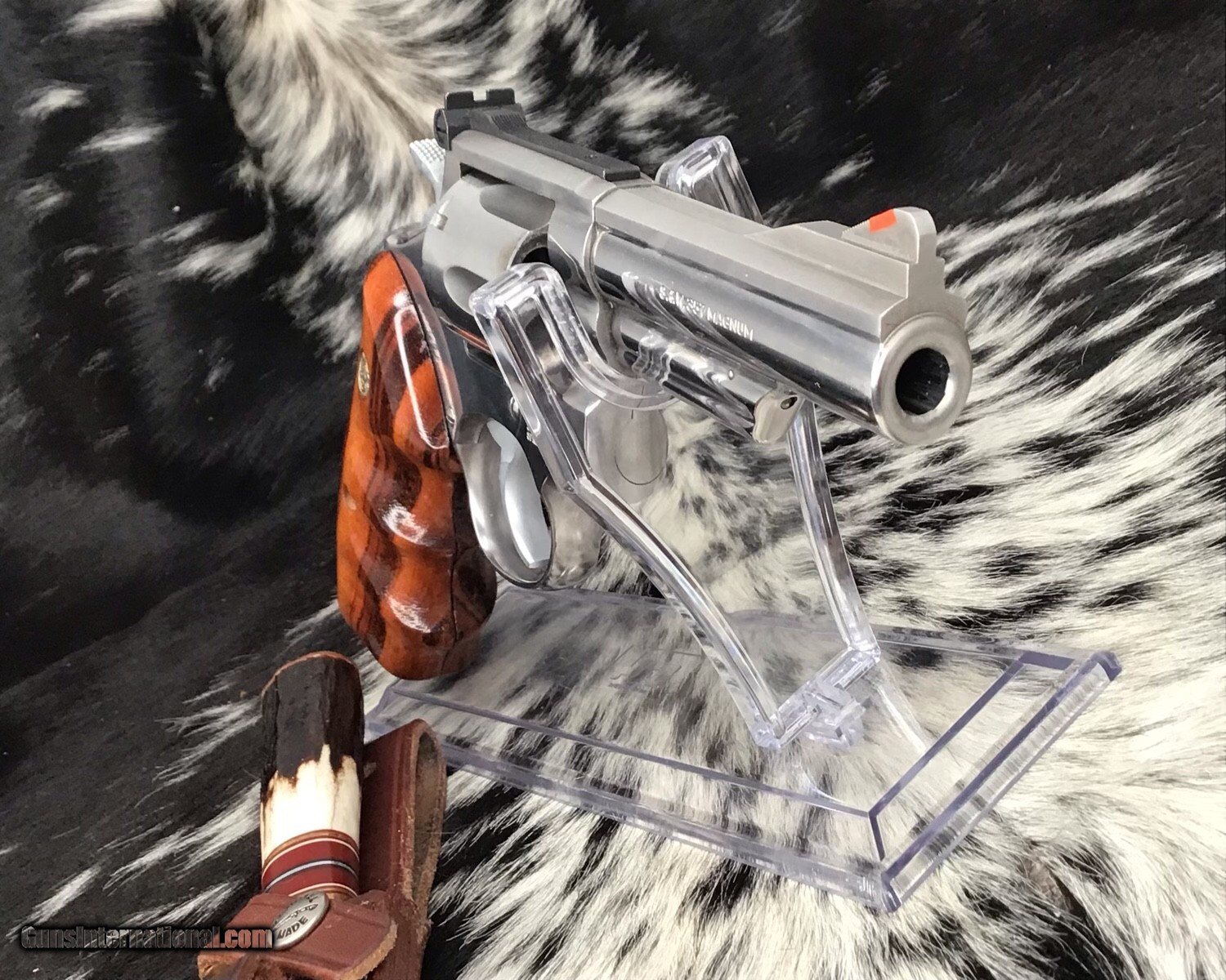 Description: Gorgeous Smith and Wesson 66-2 Combat Magnum wearing a four inch barrel, adjustable White outline rear sights with Red front blade insert. Smith and Wesson finger groove Goncalo Alves Combat grips with Silver Smith and Wesson medallions. In factory box with tools and papers. 98% condition and in excellent condition throughout. One beautiful revolver made in the USA. Add 3% if paying with credit card. God Bless America from a proud American, and a Viet Nam Vet , thankful for our freedoms.. paid for by the Blood ,Sweat and Tears of our brave men and women in uniform. Ten Below Firearms is a Veteran owned and operated business. We specialize in out of production models of high quality firearms. We love to ship! If you are out of state or can't make it to our store, just give us a call! Handguns normally ship for $30 and Long guns for $40 to $55 for extra length long guns. That's 2-3 day USPS Priority shipping, Delivery conformation and with tracking number. Optional Postal insurance is additional $1.50 per $100 and highly recommended. SOLD Handgun Caliber: .357 Magnum Manufacturer: Smith and Wesson Model: 66-2 Serial Number: AUW3331 Barrel Length: 4 inch Chambers: 6 Condition: Excellent Metal Condition: Excellent Wood Condition: Excellent Bore Condition: Excellent Action: Da/SA Finish: Stainless Steel |