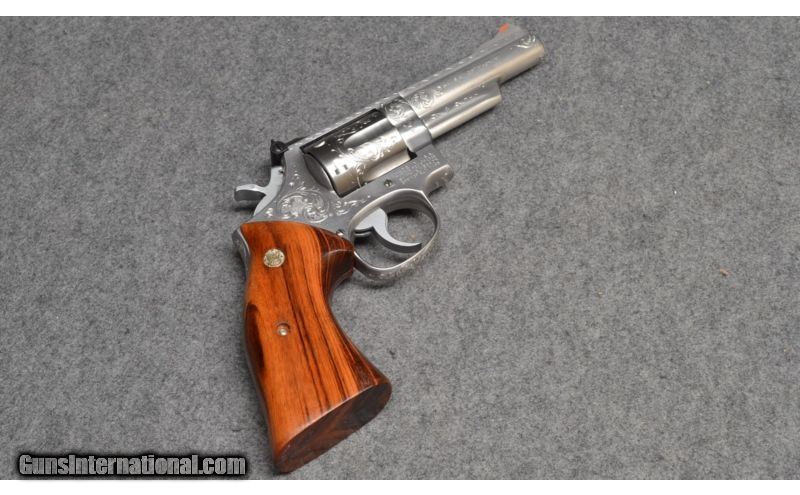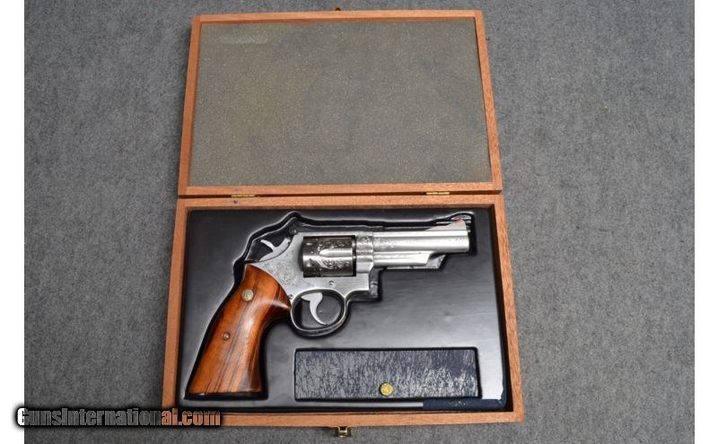 Description: This six-shot revolver is a Smith & Wesson 66-1, chambered in .357 Magnum. It has a 4" stainless steel barrel, walnut hand grips with Smith & Wesson medallion inlays, and has an engraved barrel and frame. This Smith & Wesson 66-1 is in good condition with very few signs of wear or use. Comes with wooden display case and a cleaning kit. SOLD Caliber Info: .357 Magnum. Chambers: Six-shot revolving cylinder. Metal Condition: Good. Very few signs of use or wear. Wood Condition: Good. Very few signs of use or wear. Bore Condition: Fair. Barrels: 4" stainless steel barrel. Triggers: Single metal trigger. Stock: Walnut hand grips with Smith & Wesson medallion inlays. Fore End: Engravings throughout the barrel and frame. Weight: 38oz. Sights: Factory iron sights, orange tipped front blade sight. Extras: Comes with wooden display case and cleaning kit. Item Location: Wichita, KS |