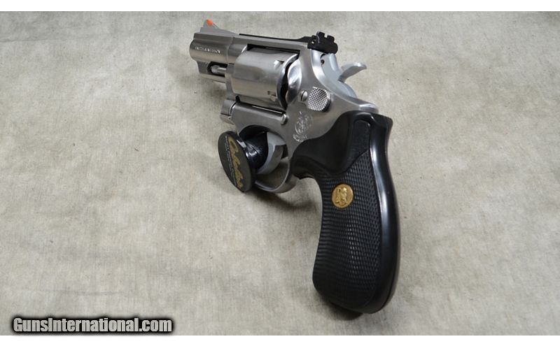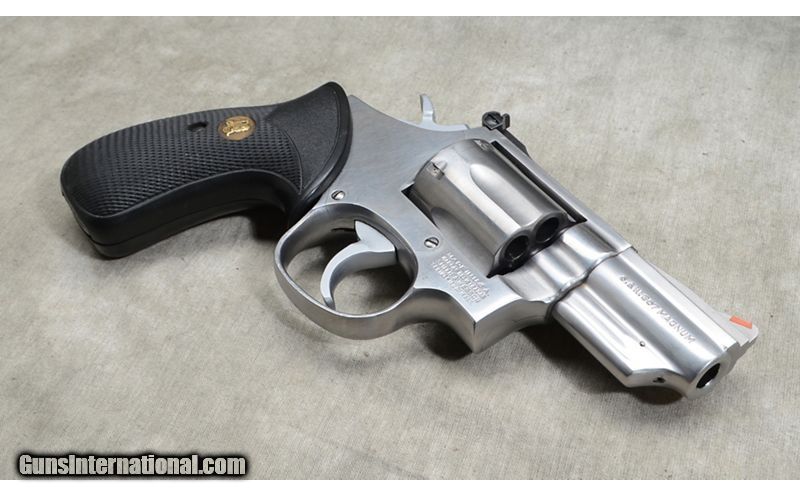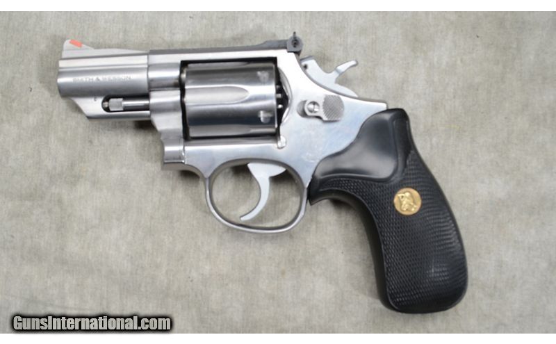 Description: Great short-barrel carry piece for trail, tackle box or everyday carry. It features soft rubber grips, adjustable sights and all stainless steel construction. .357 Magnum SOLD Chambers: 6 Metal Condition: Very good. Faint turn line and some firing residue on the front on the face of the cylinder. Wood Condition: Very good. Bore Condition: Shiny and bright with good rifling. Barrels: 2-1/2 inch Triggers: Factory single/double action trigger. Butt Pad: Pachmyr rubber grips. Weight: 34 oz. Sights: "Serrated ramp with red insert front sight, adjustable notch rear sight. Item Location: Rogers |