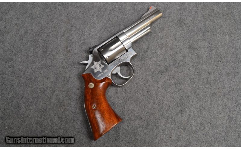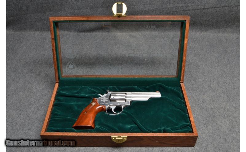 Description: This six-shot revolver is a Smith & Wesson 66-2 Limited Edition Southern Pacific Railroad Police. It has a 4" stainless steel barrel, an adjustable rear sight with orange tipped front blade sight, and walnut grips with golden Smith & Wesson medallion inlays. This Smith & Wesson 66-2 is in very good condition. Comes with a wooden, "Southern Pacific Railroad Police" display case. SOLD Chambers: Six-shot revolving cylinder. Metal Condition: Very good. Few signs of use and wear. Wood Condition: Very good. Few signs of use and wear. Bore Condition: Good. Barrels: 4" stainless steel barrel. Triggers: Single metal trigger. Stock: Walnut hand grip with golden Smith & Wesson medallion inlany. Stock Dimensions: Southern Lines Pacific badge engraved in to the frame with "1878 to 1986" engraved underneath. Fore End: Southern Pacific Railroad Police" engraved on the barrel. "Limited Edition 151 of 262" engraved below the cylinder. Weight: 36oz. Sights: Adjustable rear iron sight with orange tipped front blade sight. Extras: Comes with wooden, "Southern Pacific Railroad Police" display box. Item Location: Wichita, KS |