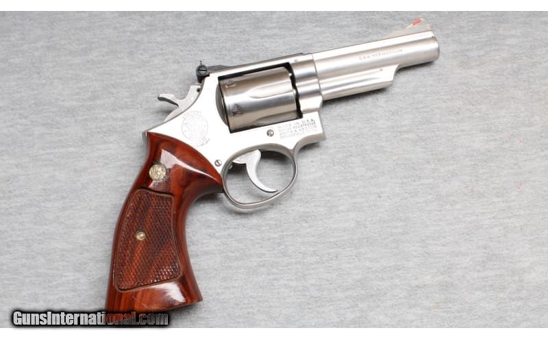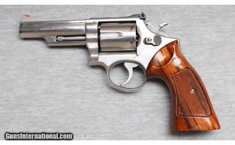 Description: Very good condition, light finish wear, small nicks and scratches, comes with original box. Medium frame magnum revolver, 4" pinned barrel with shrouded ejector, stainless finish, 6 shot fluted cylinder and checkered hammer & cylinder latch. Adjustable rear sight & ramp front sight with red insert and S&W wood target grips. .357 Mag SOLD Chambers: Revolver Metal Condition: Very good Bore Condition: Bright Barrels: 4 Triggers: Double and single action Butt Pad: Wood grips Sights: Adjustable rear and ramp front sights Item Location: La Vista, NE |