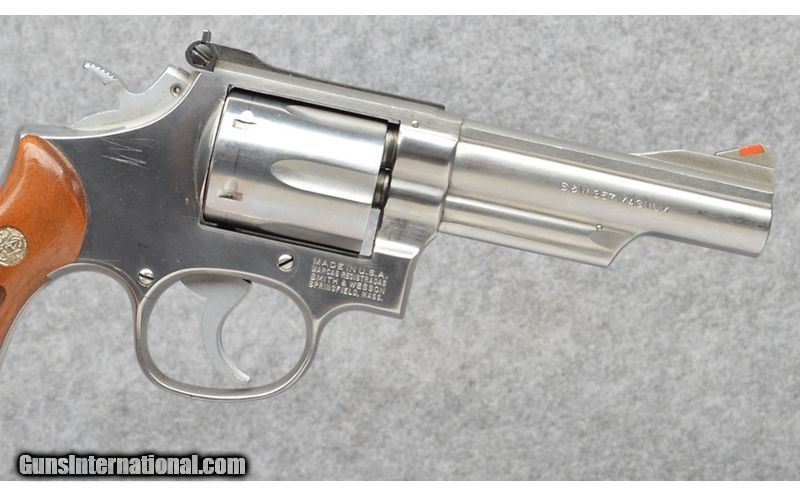 Description: 1980 vintage, shows handling and a few pin-point freckles. Well timed with firm lock-up. .357 Magnum SOLD Metal Condition: Brushed Stainless Wood Condition: Walnut service grips. Bore Condition: Bright Sharp Barrels: 4 Inch Triggers: DA/SA Weight: 36 oz. Sights: "Adjustable Rear Sight, Red Insert Front Item Location: Buda, TX |