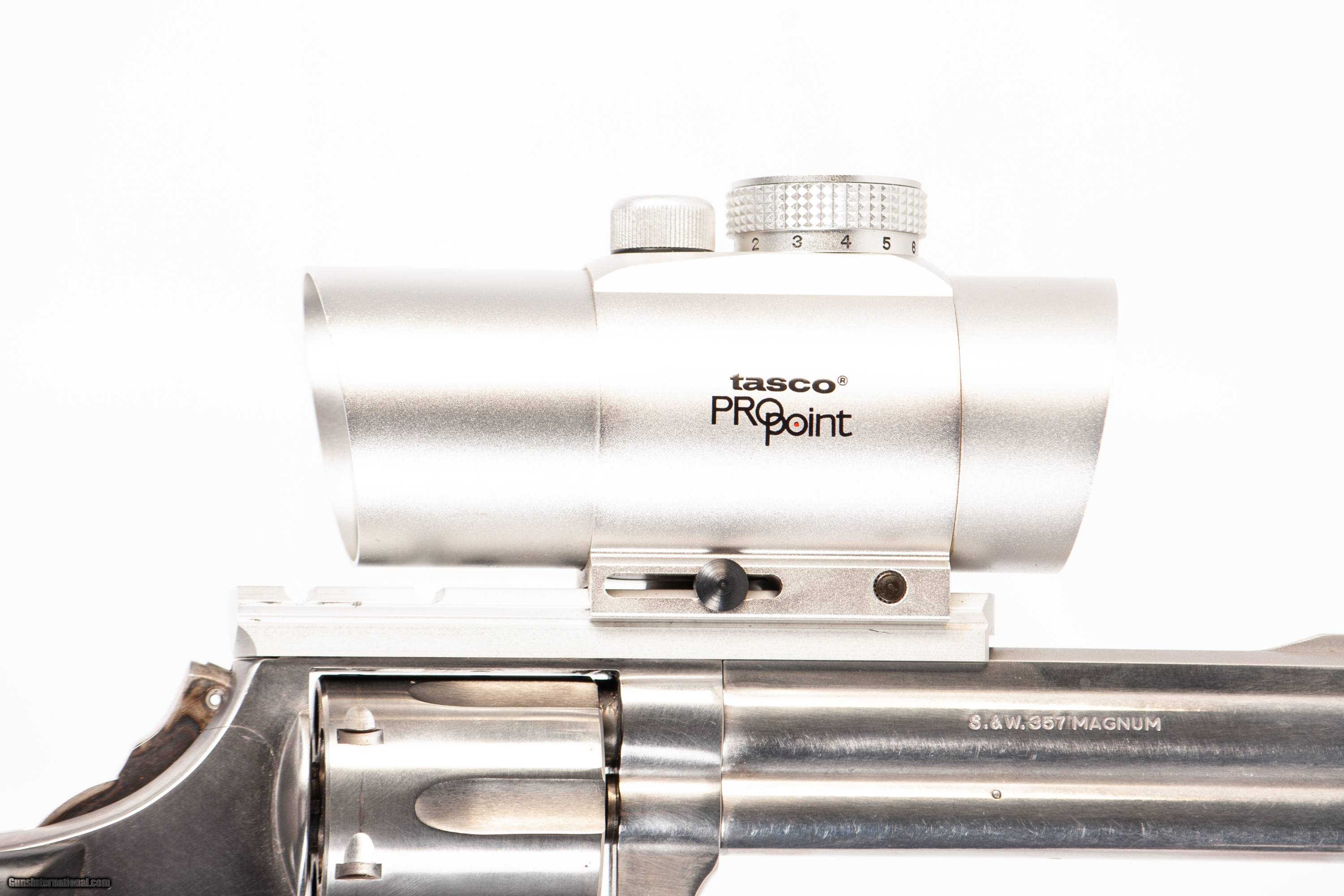 SMITH AND WESSON 686-4 CHAMBERED IN 357 MAG WITH A 5 7/8 INCH BARREL BRIGHT & SHINY BORE AND A TASCO PRO POINT RED DOT OPTIC. THIS GUN IS IN EXCELLENT CONDITION AND IS COVERED BY DURY'S LIFETIME WARRANTY.