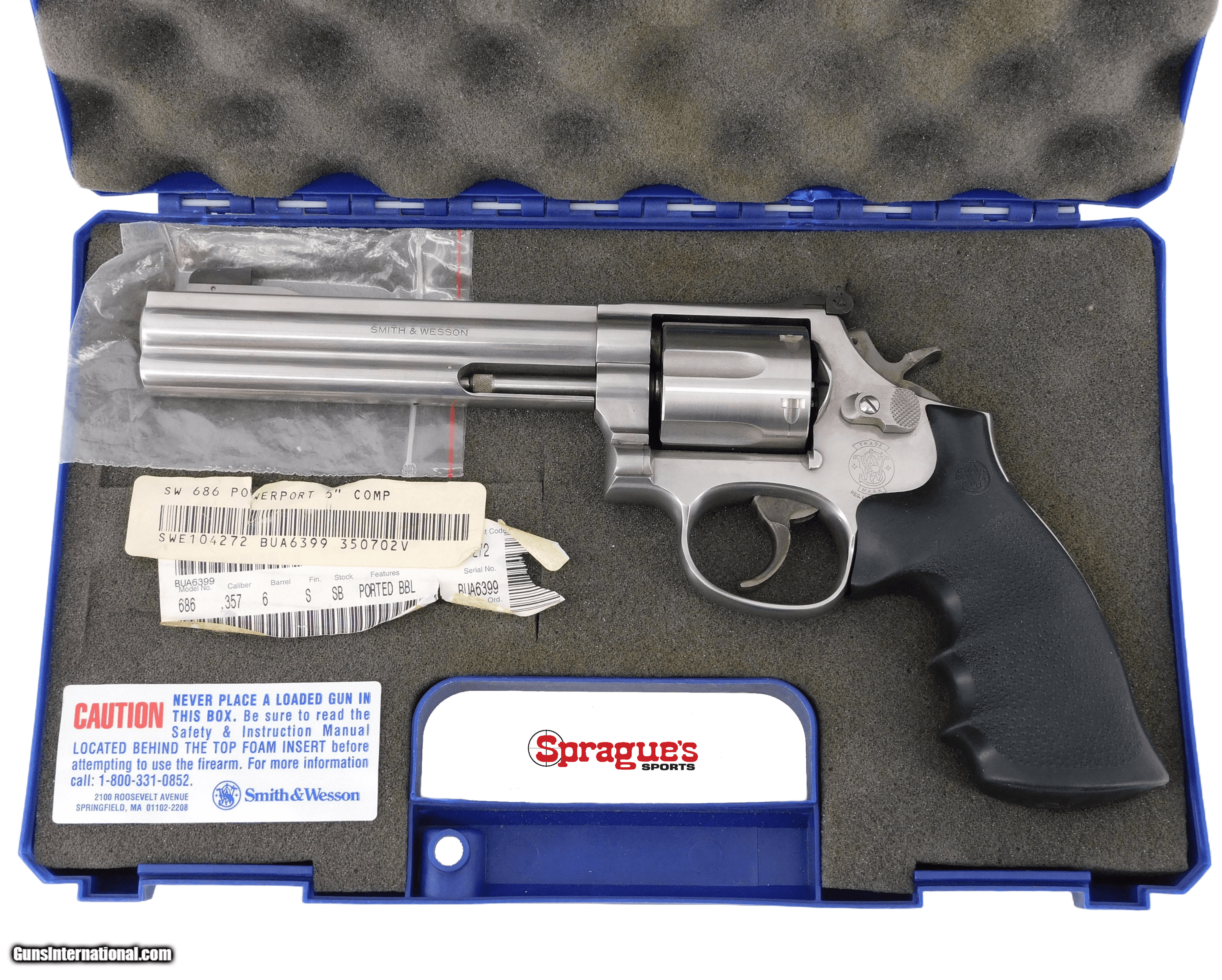 Description: Smith & Wesson 686-4 Stainless Steel 6 Shot Revolver 6" .357 Mag PENNY - NO RESERVE - NO CCF !!! Manufacturer: Smith & Wesson Model: 686-4 Caliber:.357 Magnum Manufactured:1993 – 1995 Barrel:6", bright shiny bore, good rifling, Power Port in front of front sight Rear Sight:Adjustable square notch Front Sight:Blade Style Optic:N/A Finish:Brushed stainless steel Action:Double/Single action revolver, mechanically solid, fed by 6 chamber fluted swing out cylinder, checkered cylinder release, color case hardened smooth trigger - checkered hammer spur, light handling marks Grips:Black textured Hogue MonoGrip Accessories:Original case Condition:This is a very good example of a used Smith & Wesson 686-4 stainless revolver. Overall very light handling marks Serial Number:BUA6399 Sprague's Number:154310 /jb +++++++++++++++++++++++++++++++++++++++++++ Add 3% for Credit Card Shipping: $40.00 in the 48 contiguous United States +++++++++++++++++++++++++++++++++++++++++++ This handgun will be a GREAT addition to your future outings! In-house pictures are of the item(s) being ed and the item(s) that will be shipped to the highest ! If there are no boxes, documentation, accessories, etc. shown in the pictures or described in the description, they are not included. Any stock pictures will be labeled as such. PRIOR TO PURCHASE!!! We will do our best to answer all questions Monday through Saturday during business hours, but are CLOSED ON SUNDAY. PLEASE ALLOW 7-10 BUSINESS DAYS FOR PROCESSING PRIOR TO BEING SHIPPED ONCE PAYMENT AND FFL INFORMATION HAVE BEEN RECEIVED. Buyers are responsible to ensure that you have fully reviewed the listing before purchase. You will be held responsible for any purchase(s) that you make. Buyers are responsible to know and ensure that they are in compliance with local, state, and federal regulations/laws and are of legal age for items purchased. We have not test fired any firearms unless specifically noted in the description. Have a GREAT SAFE HEALTHY day! SOLD |