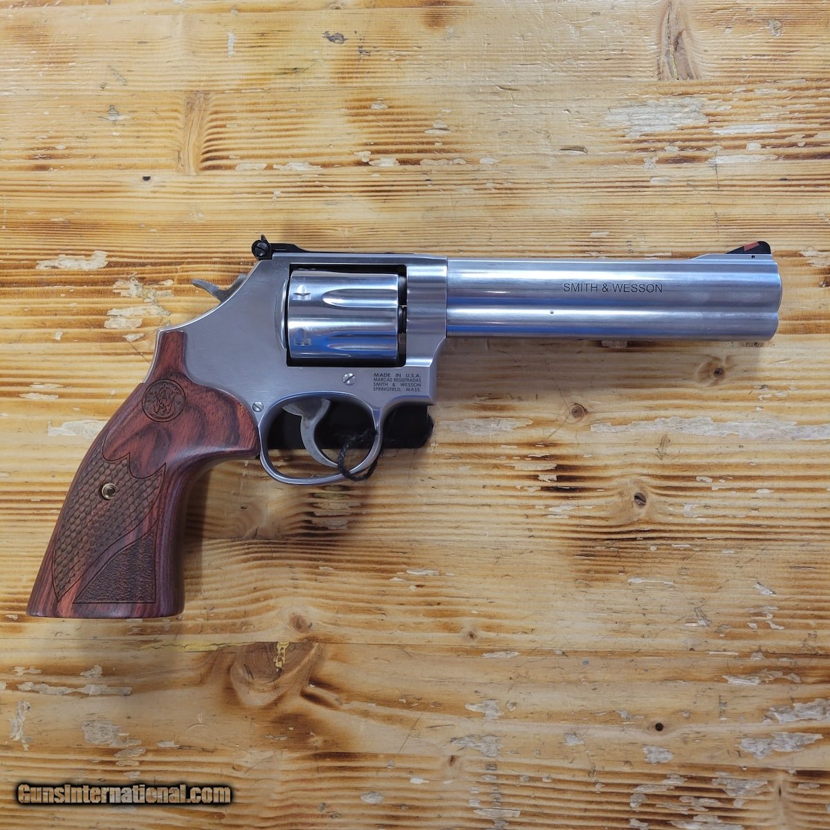 Description: Guns Listing ID: 904002 Smith & Wesson, 686 Plus, Deluxe, Double Action, Metal Frame Revolver, L-Frame, 357 Magnum, 6\" Barrel, Stainless Steel, Silver, Wood Grips, Adjustable Sights, 7 Rounds Stainless steel Textured wood grips Satin finish Adjustable rear sight Product Description Elegant and functional, the Model 686 Plus Deluxe pairs the highly popular Smith & Wesson 686 revolver with elegant textured wood grips in the classic look. Chambered with 7 rounds of .357 Magnum, the all stainless steel Model 686 Plus Deluxe offers compact powerful protection, sport shooting and collecting all in one. SOLD Manufacturer: SMITH & WESSON Model: 686 DELUXE Caliber Info: .357 MAG Condition: Used - Non-Certified Barrels: 6 BARREL Finish: STAINLESS |
