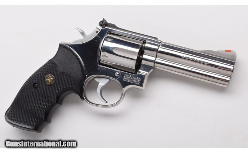Description: Pre-owned Model 686 "No Dash" with custom high polished with matte eggshell on the topstrap and cylinder flutes. Solid, shows scattered small rubs and scratches. Pachmayr grips. .357 Magnum SOLD Metal Condition: Polished Stainless Bore Condition: Bright Sharp Barrels: 4 Inch Triggers: DA/SA Weight: 43 oz. Sights: "Adjustable Rear Sight, Red Ramped Front Item Location: Buda, TX |