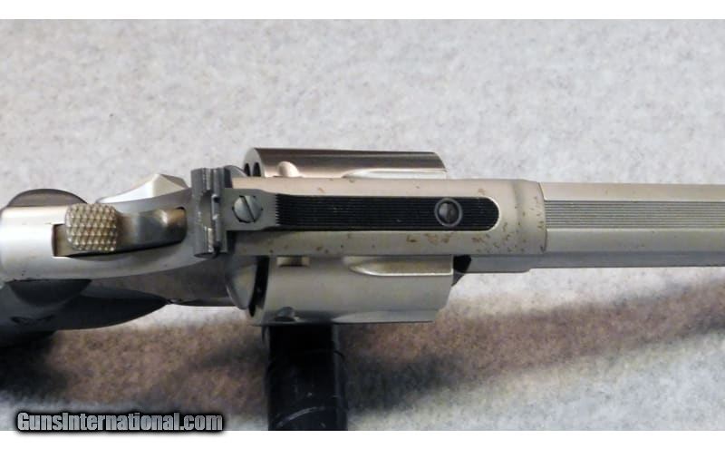 Description: Smith & Wesson ~ Model 686-5 ~ Chambered in .357 Magnum. Is a double action stainless steel revolver, featuring a 7 shot cylinder and 6" barrel paired with rubber grips for comfort and control. .357 Magnum SOLD Chambers: .357 Magnum. Metal Condition: Good condition. Bore Condition: Fair condition. Barrels: 6" inches. Triggers: 5 pounds. Weight: 2.75 pounds Sights: Iron sights. Item Location: Acworth, GA |