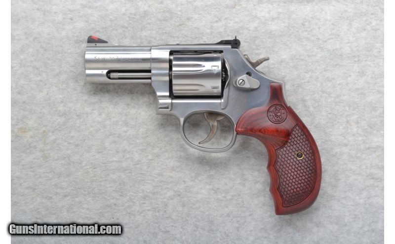 Description: SOLD Caliber Info: .357 Magnum Chambers: 7 shot. Metal Condition: Very good. Wood Condition: Excellent. Bore Condition: Very good. Barrels: 3 inch stainless steel. Triggers: SA/DA Stock: Scale textured hardwood laminate with S&W logo. Weight: 37 oz. Sights: Blade front with orange. Adjustable white outline notch rear. Item Location: Richfield, WI |