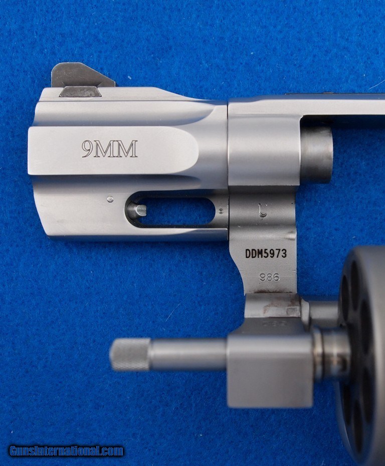 Description: S&W Performance Center M986 Tuned Action 9MM WBox, 2.5" bbl, shiny bore, good rifling, Stainless Steel finish, adjustable rear sight, red ramp front sight, 7 shot Titanium cylinder, two packages of 8 moon clips, and custom wood grips. Add 3% for Credit Card Shipping $25.00 SOLD |