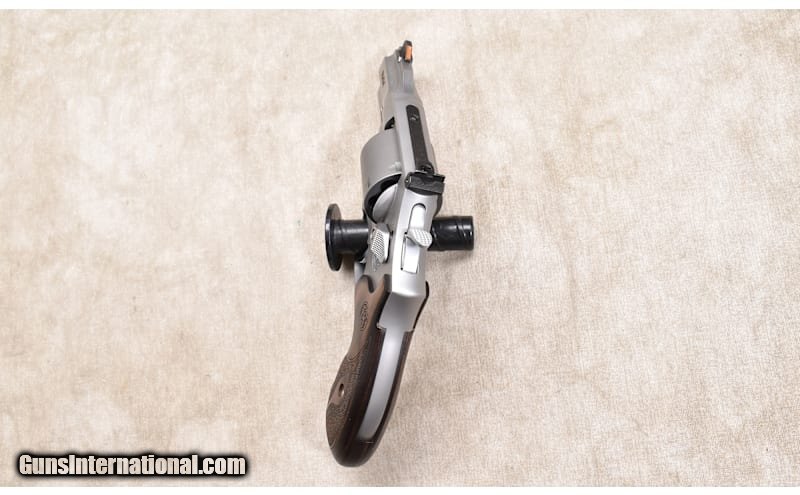 Description: Nice 'snubbie' 7-shooter that uses moon clips to hold the 9mm Luger cartridges. It will make a very good trail carry gun as well as a defense revolver for purse, pocket, or night stand. 9mm Luger SOLD Chambers: 7 rounds Metal Condition: Very good. Some powder residue on the cylinder face and a faint turn line. Wood Condition: Excellent. Bore Condition: Shiny and bright with good rifling. Barrels: 2-1/2 inches Triggers: Factory double and single action trigger. Butt Pad: "Checkered laminated wood, combat style finger groove. Weight: 32 oz Sights: Post and adjustable notch "iron" sights. Item Location: Rogers |