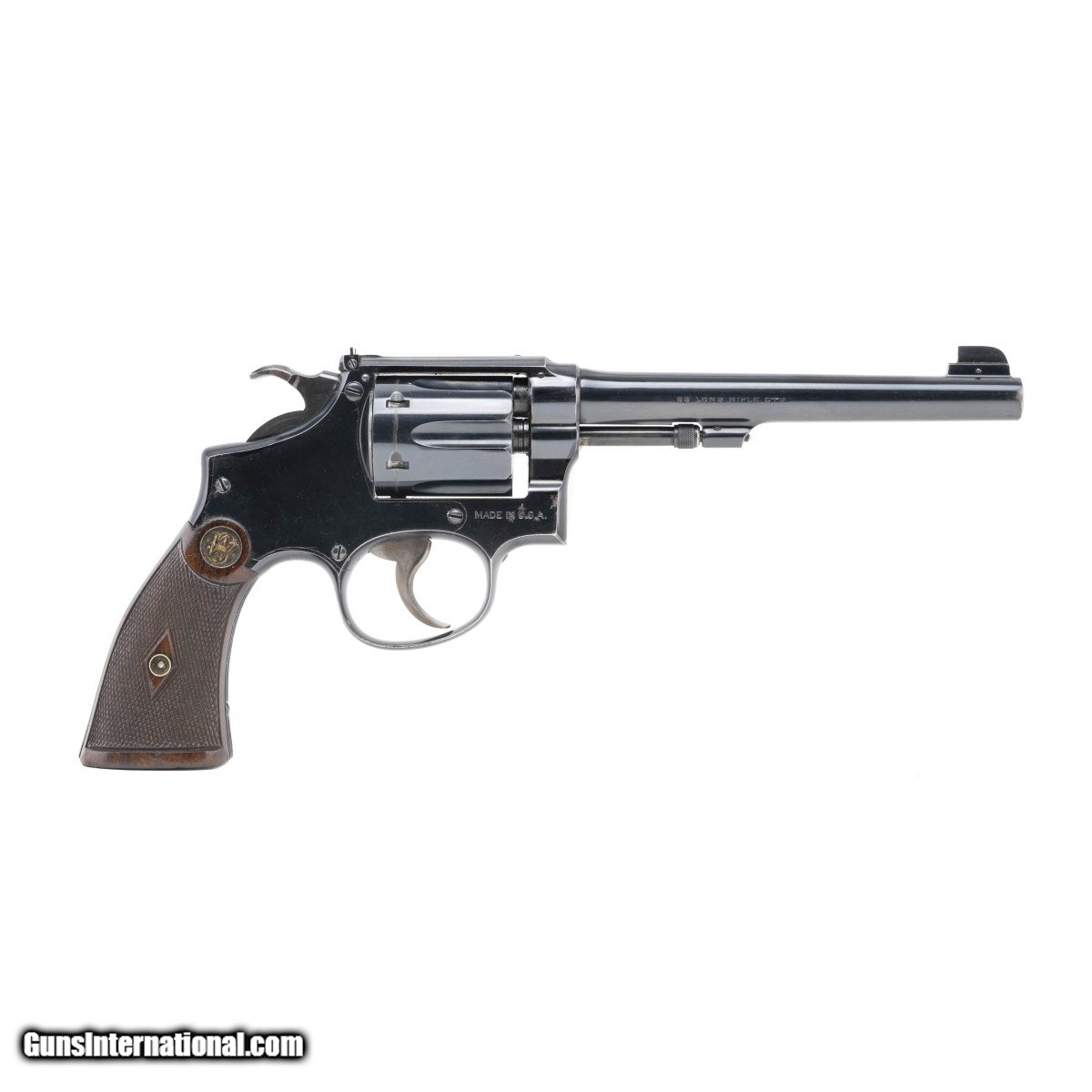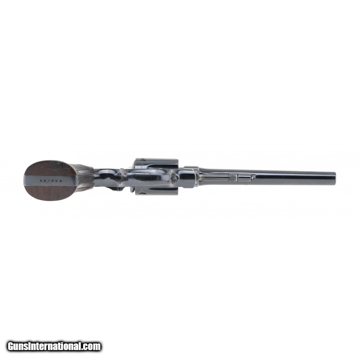 Desirable pre-war revolver. Bore is excellent. Correct Partridge front sight and adjustable rear sight. Barrel is 6"". Revolver has some wear, and is in very good overall condition. Serial number 634756.