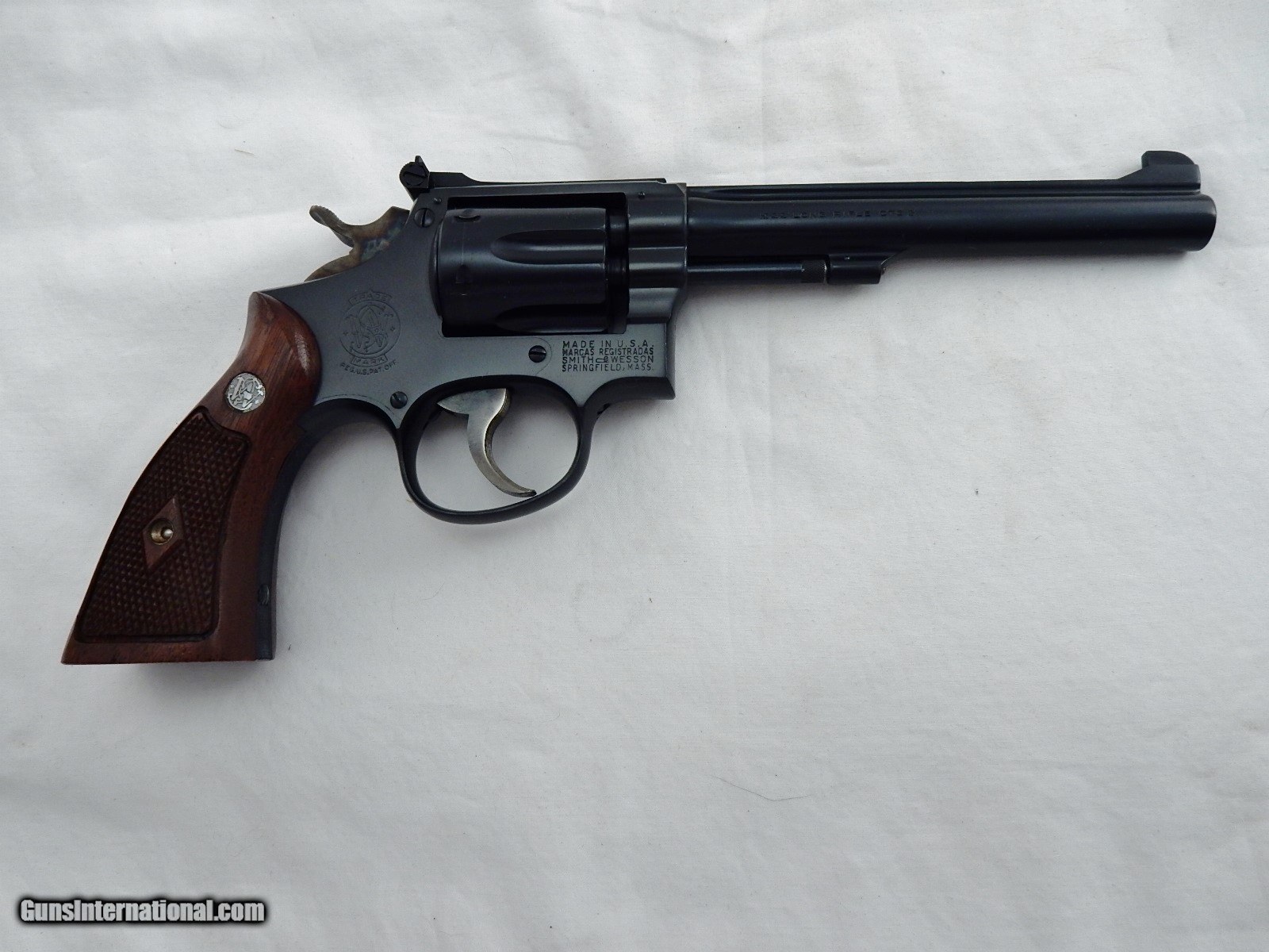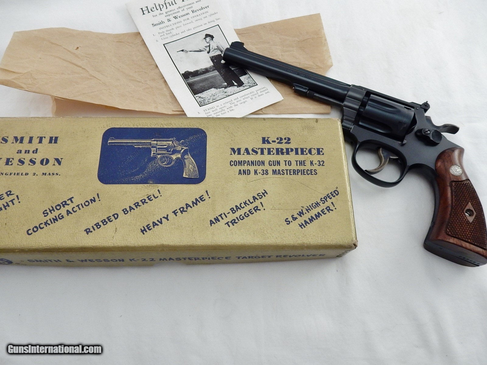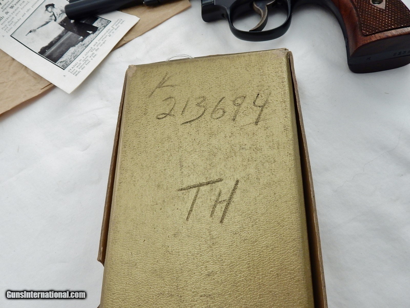 Description: This is a Smith Wesson K22 with a 6 inch barrel. This gun is 99% in the box with factory target hammer. Serial # is K213xxx. Buyer pays 35.00 shipping. Thank you. 47-9-9 SOLD |
