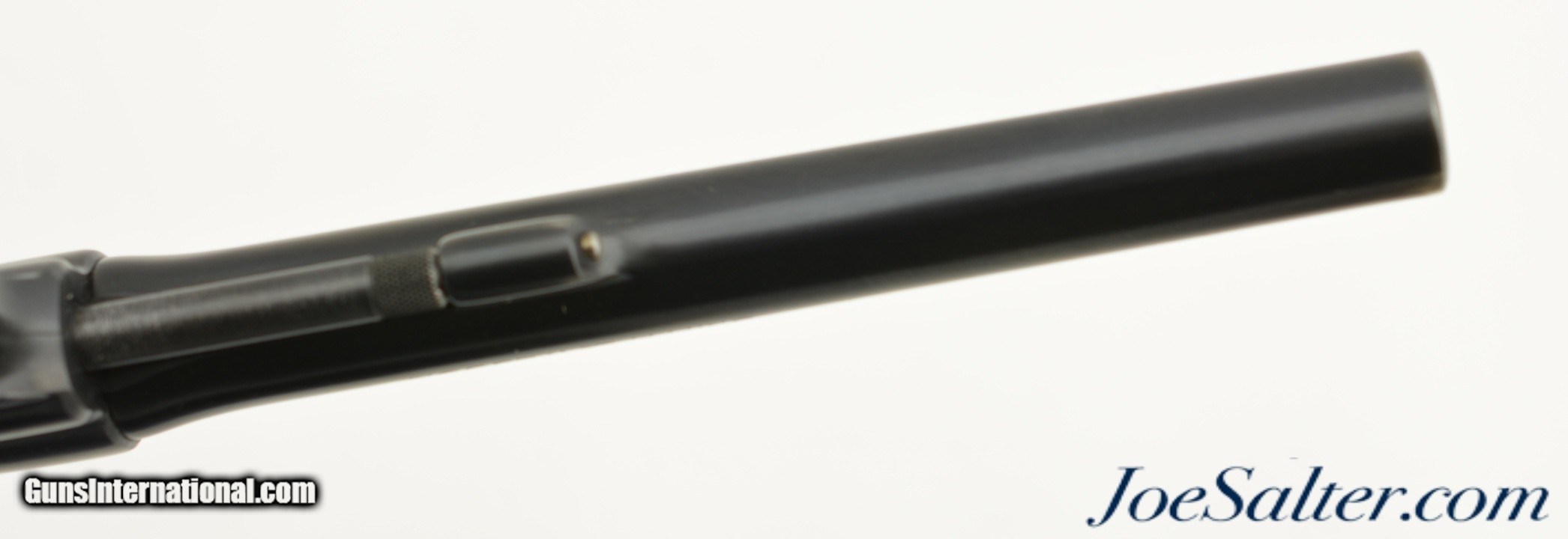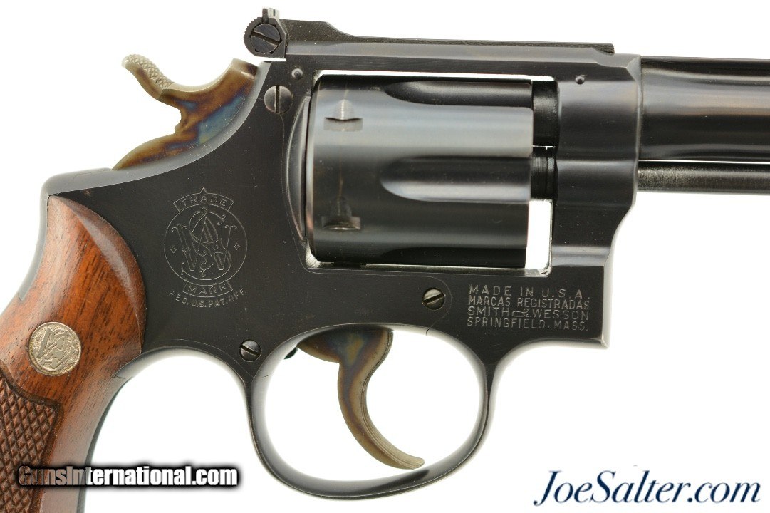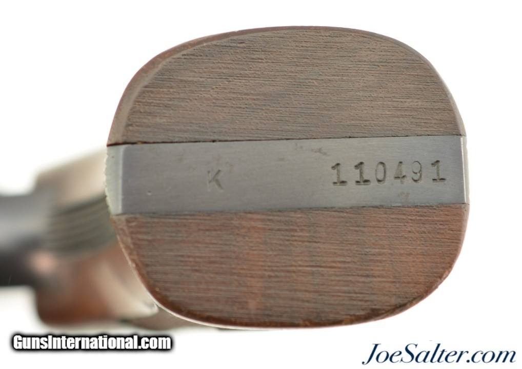 Description: Serial #K110491, .22 LR, 6 inch barrel with a bright, excellent bore. This is the K-22 Masterpiece revolver manufactured in 1951 featuring adjustable micrometer click rear target and plain 1/10" Patridge front sights. In excellent plus condition the barrel, frame and cylinder show virtually all, 97-98% of the original blue finish with a hint of wear at the muzzle and faint turn line. The trigger and hammer show vivid case-hardened colors. The diamond around screw escutcheon checkered walnut S&W monogram grips rate excellent. It comes in a correct original blue Cardboard S&W box. A beautiful early 1950's K-22 Masterpiece that will add to any collection. FFL or C&R SOLD Curio/Relic: Yes |