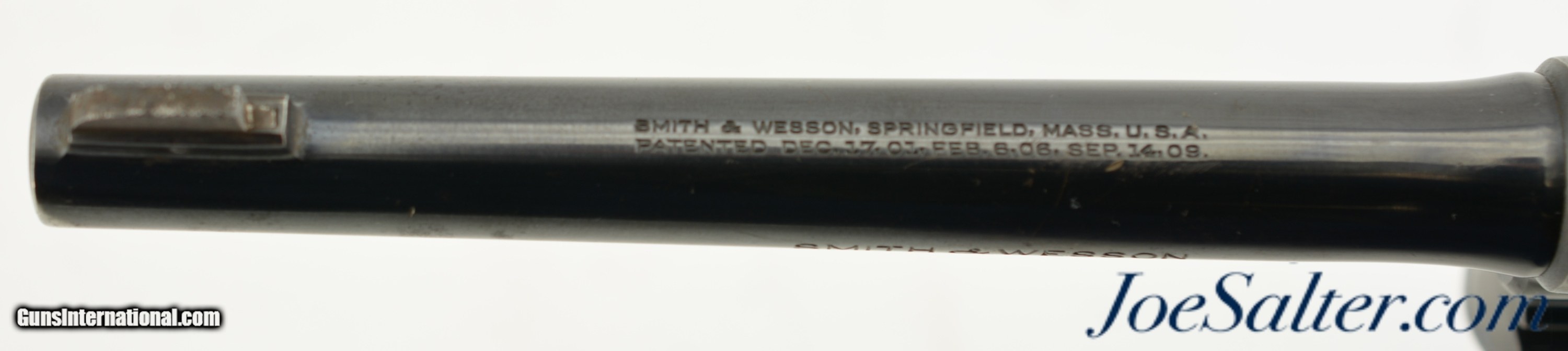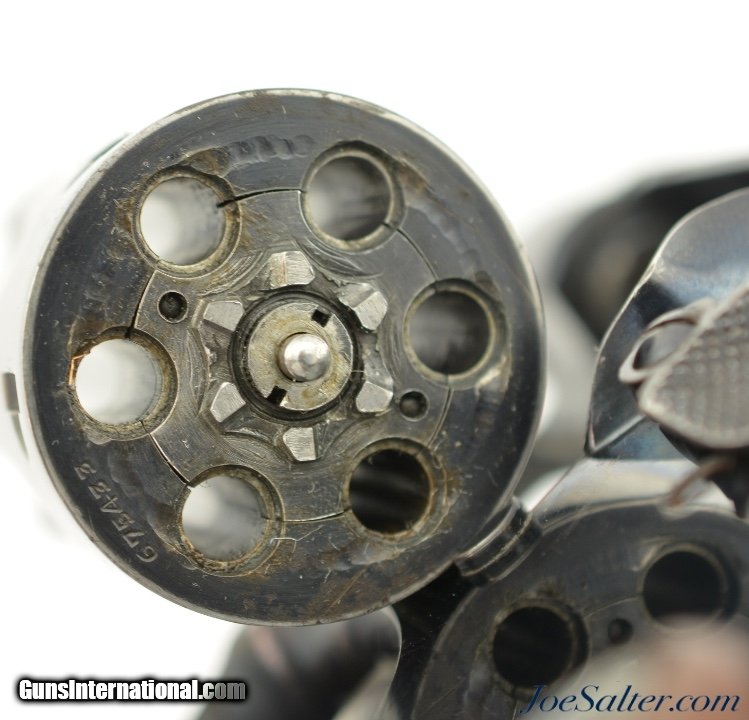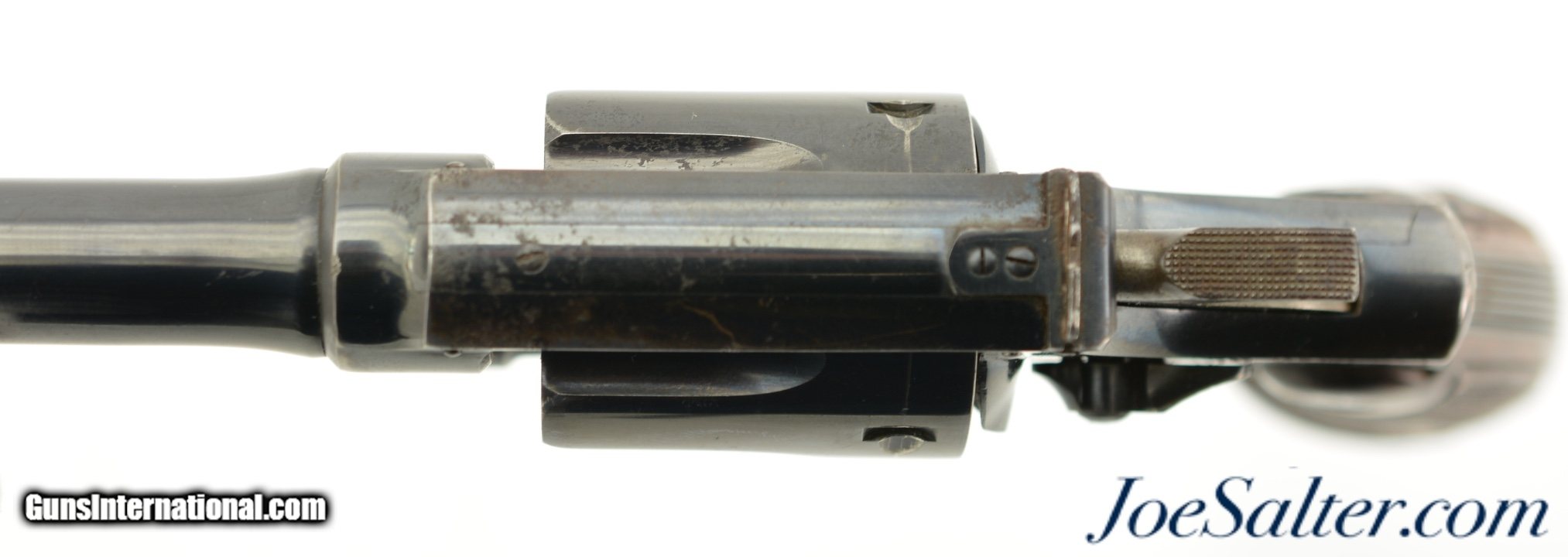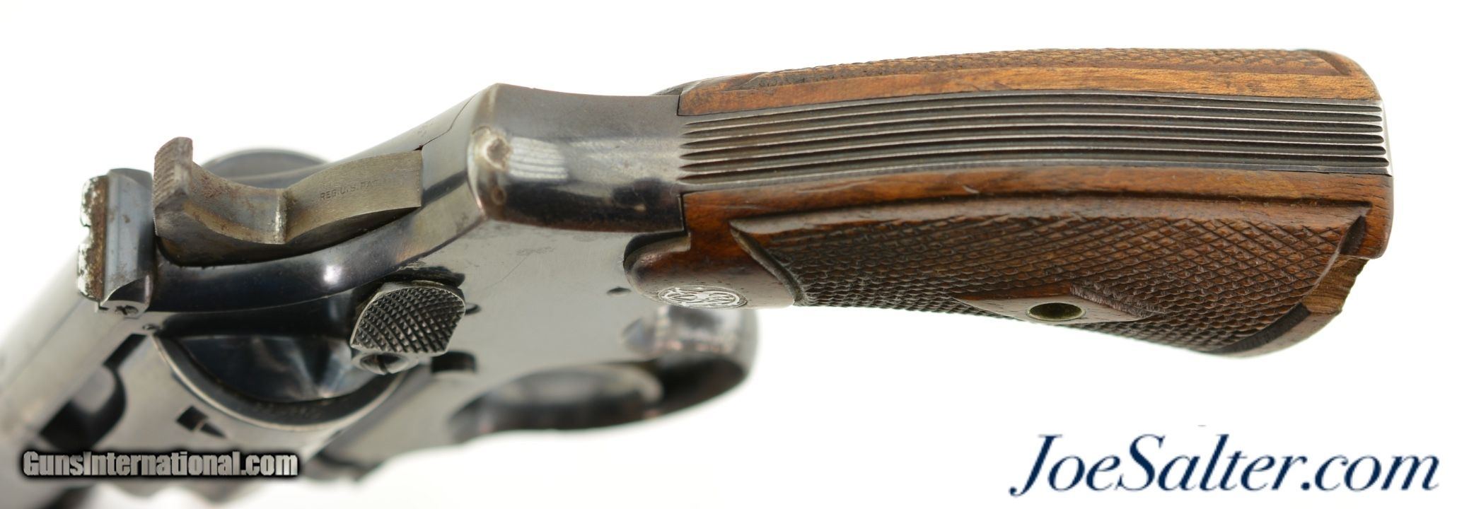 Description: Serial #675433, .22 LR, 6" barrel with an excellent, bright bore. This is a handsome revolver that has matching numbers on the frame, barrel, cylinder, yoke, and extractor. The metal retains 90-92% of the original blue finish, with silvering and plum-brown freckling at the muzzle, along the high edges, and along the trigger guard bow. A thin turn-ring is present on the cylinder as well. The early profile Humpback hammer and grooved trigger retain about 60-70% of the original color case-hardening, with the balance having a mottled plum-brown patina with thin surface freckling and some pinprick pitting. Original adjustable rear sight is still present, and the Patridge style front sight blade has cleaned moderate freckling and pinprick pitting throughout. The checkered walnut, diamond-center grips are correct, but numbered to a different gun on the interior. The wood has small handling marks and minor blemishes scattered about both panels, as well as several chips on either side at the butt flare. There is also minor flattening to the points. The lock-up is tight and the action functions flawlessly. The cylinder shows evidence of firing out of time, with dimples on face. I have owned and fired this gun over the last several years and it works great timing and locking. This is a very nice pre-war K-22, with the early long-action, and is in very good-near fine condition overall. FFL or C&R SOLD Curio/Relic: Yes |