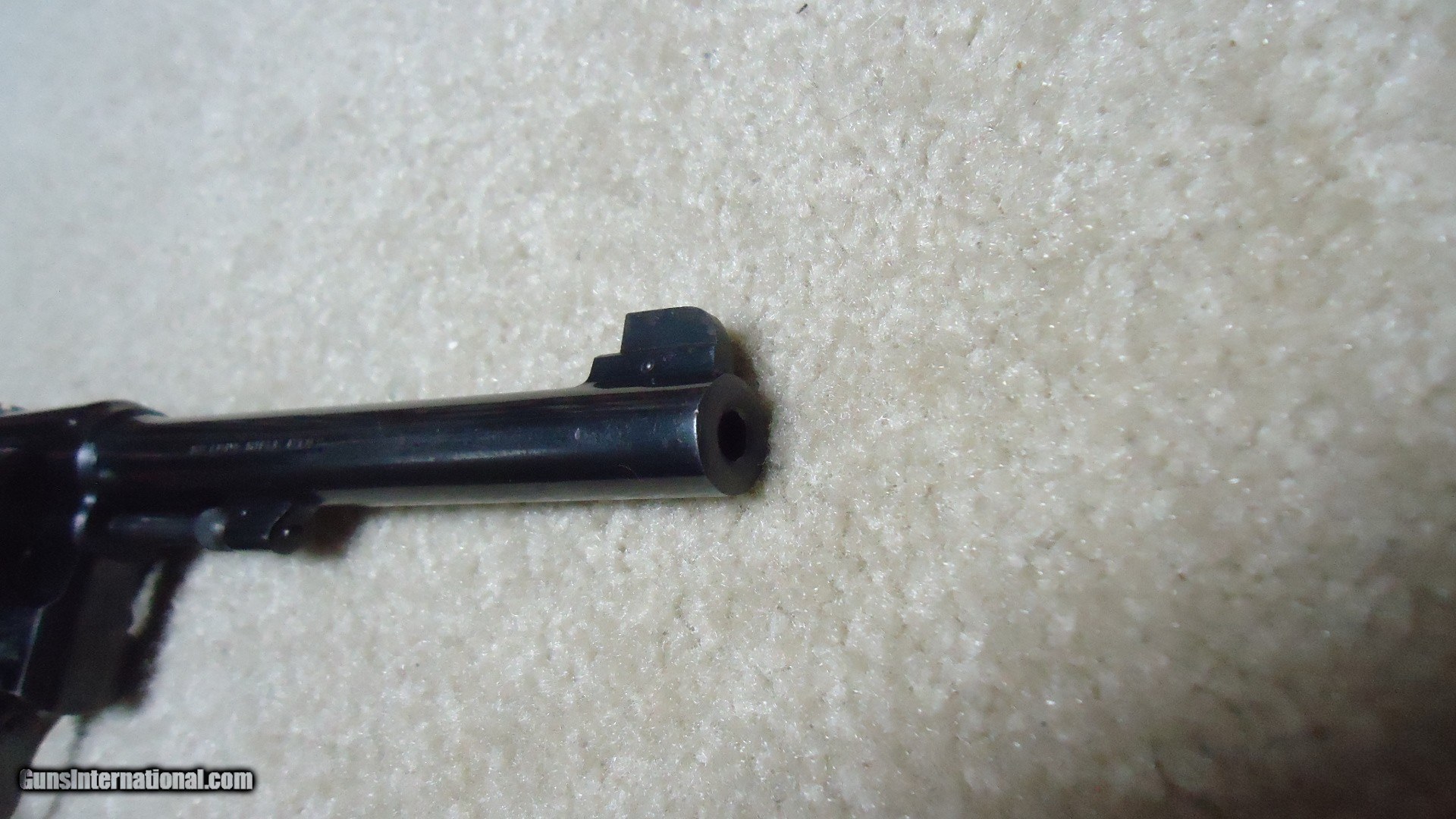 Description: PRE-WAR K-22 OUTDOORSMAN TARGET REVOLVER, ONLY 19,500 MADE DURING THE GREAT DEPRESSION YEARS OF 1931-1940 BETWEEN SERIAL NUMBERS 632124-682419.THIS ONE IS A MID-PRODUCTION REVOLVER #665277. During this time of terrible economic conditions in the U.S. and with very limited sales of expensive revolvers, S&W could only keep in their employ their finest craftsmen and gunsmiths. The revolvers, especially the target sighted versions, turned out during this time were some of the finest ever made as extra time was available to hand fit and tune each revolver. The smoothness of the actions on these revolvers is truly remarkable. This is a lightly used example that has excellent sharp checkered diamond grips with S&W medallions that are matching numbered inside to the cylinder, frame and barrel. Most of the bright high polished blue remains with only some light spotting to the finish toward the muzzle on the left side of the barrel and on the frame below the cylinder on the right side. All markings are sharp and clear. There is fine case colors on the hammer and trigger. Target sights are correct. Bore is excellent and the front face of the cylinder shows good blue indicating that this revolver was not fired much. Screws appear unturned. Comes with an old Brauer Brothers, St. Louis flap holster with the underlined initials "R. A. P." on the flap. SOLD Curio/Relic: Yes Handgun Caliber: .22 Long Rifle Manufacturer: SMITH & WESSON Model: K-22 OUTDOORSMAN Serial Number: 665XXX Barrel Length: 6 1/2 Condition: FINE+ Bore Condition: EXCELLENT |