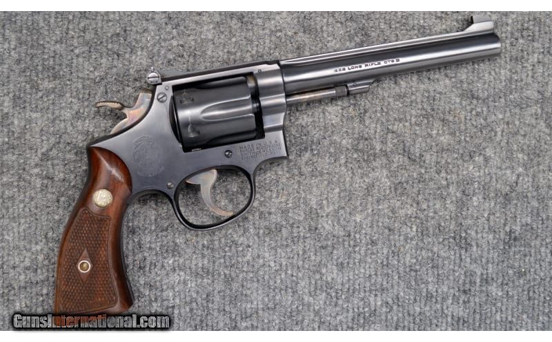 Description: For your consideration, a Smith & Wesson model K22 chambered in .22 Long Rifle. Features include a 5-screw frame, diamond-inset grips, a pinned barrel, and recessed chambers. This piece dates to 1954. .22 Long Rifle SOLD Curio/Relic: Yes Chambers: 6 Metal Condition: Excellent Wood Condition: Excellent Bore Condition: Excellent Barrels: 6 Triggers: Serrated Weight: 2.25 lbs Sights: Iron Sights Item Location: Hamburg, PA |