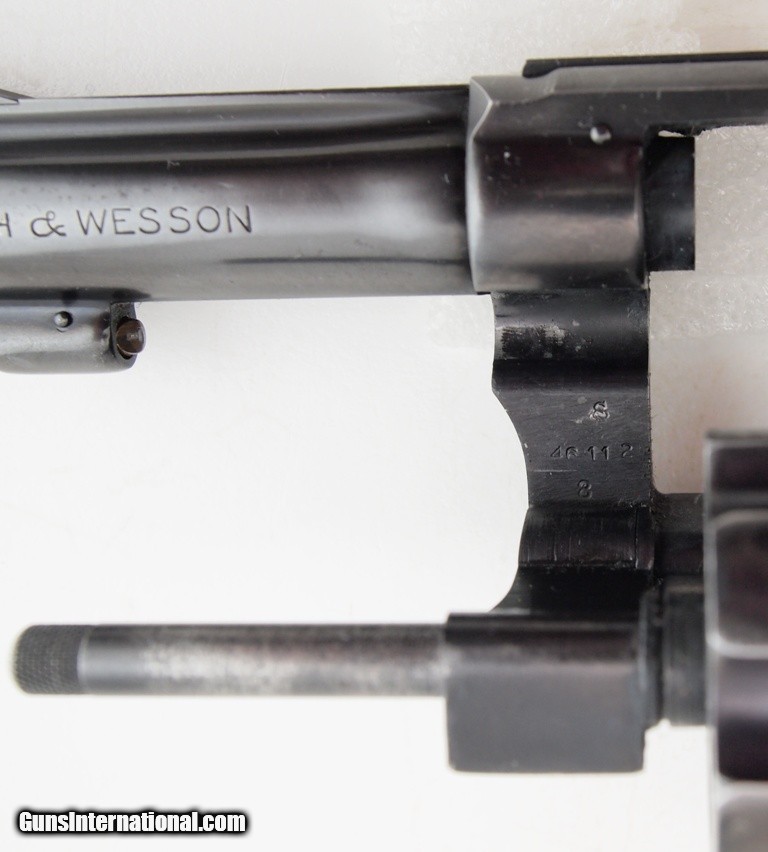 Description: S&W K22 MFG 1952 .22 LR, K22 Combat Masterpiece, 5 screw, 4" bbl, service hammer - trigger, matching serial number, Diamond Magna grips. Good condition with some grey at the muzzle. Add 3% for Credit Card Shipping $25.00 SOLD |