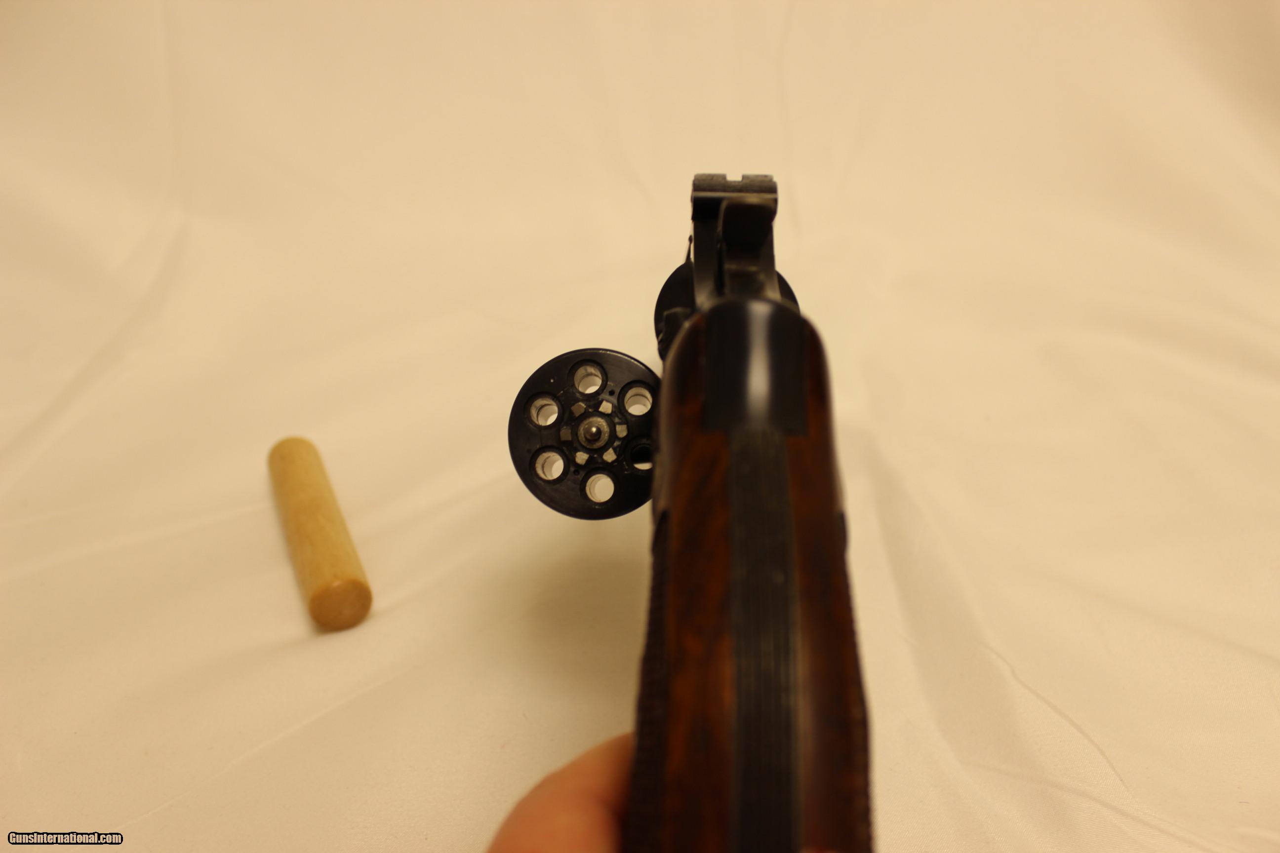 Description: .22LR 6" pinned barrel with an excellent bore. This 1947 made revolver retains about 99% original blue with some light high edge wear and a light turn ring on the cylinder. The standard trigger and standard hammer retain bold case hardened colors with light operational marks. The un-numbered diamond checkered walnut factory target grips with silver S&W medallions rate very good to excellent with light scuffing on the base edge and a few scattered dents. This five screw revolver featured black blade micro adjustable factory rear site and Patridge front sight. The crane is correctly numbered to the gun but no serial numbers appear on the cylinder, barrel, and extractor. There is no factory refurbish marks found on the gun. SOLD |