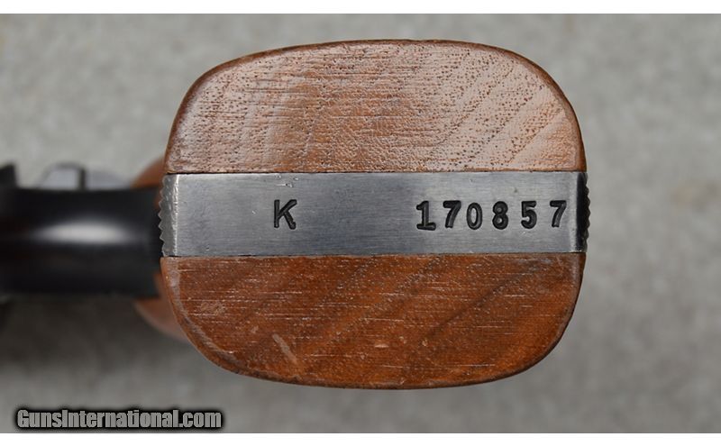 Description: S&W K-22,also known as "Pre-Model 17" and was manufactured from 1946 until 1957. The gun has the "four line address" stamped in metal reading "Marcas Registradas". This revolver has a jeweled hammer and trigger. Light wear on the cylinder and muzzle. SN: K 170857 .22 Long Rifle SOLD Metal Condition: Excellent Wood Condition: Excellent Bore Condition: Clean Barrels: 4 Butt Pad: Wood Grips Weight: 2 lb 4 oz Sights: Adjustable Rear Item Location: Fort Worth, TX |