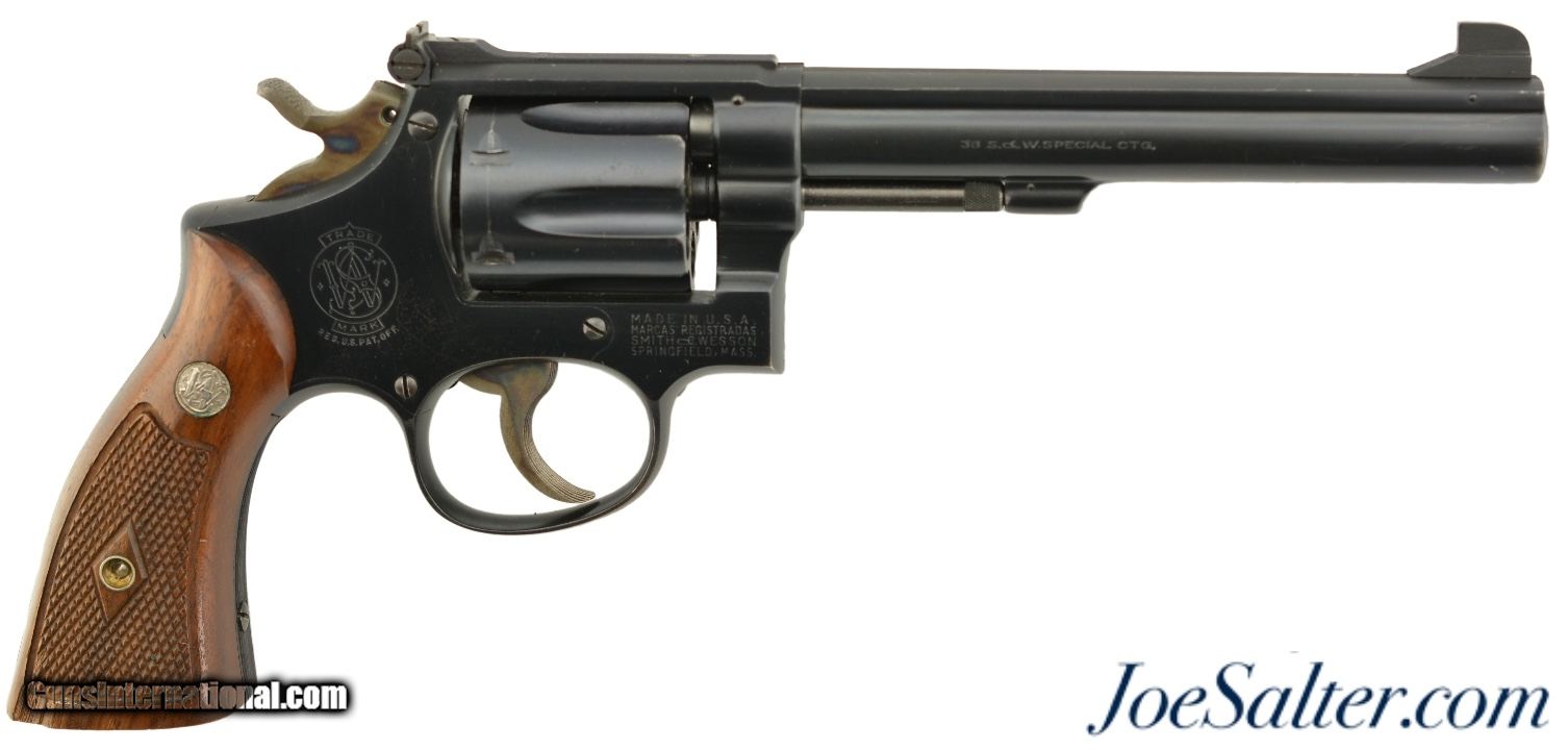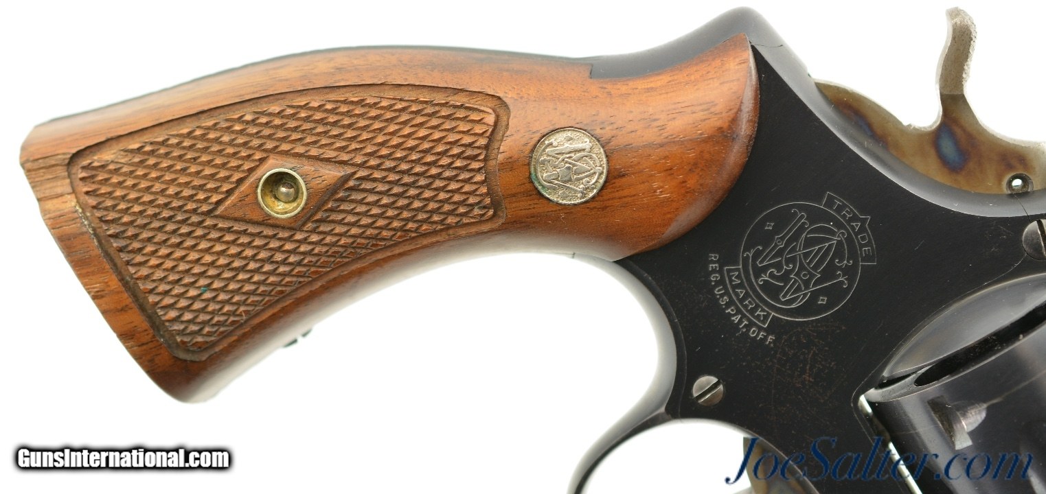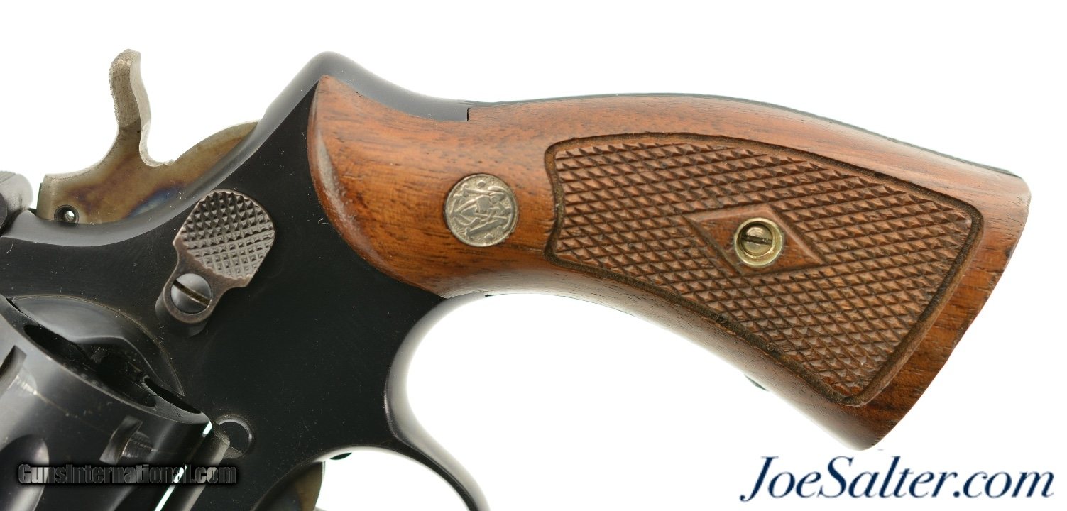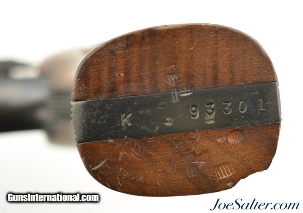 Description: Serial #K93301, .38 Special, 6" barrel with an excellent, bright bore. This is an early 1950s revolver that has matching numbers on the frame, barrel, cylinder, yoke, and extractor. The metal retains 97-98% of the original blue, with some mild silvering along some of the high edges, a faint turn-ring on the cylinder, and a few specks of plum-brown flaking on the yoke hinge. The hammer and trigger have most of their original color case-hardening remaining, with some gray fading along the edges. The checkered, diamond-center grips are numbered to the gun on the interior, and are in good shape overall, although there are some small chips and peen marks at the butt. This is a fine example of a five-screw K-38, and would make a great addition to a collection. FFL or C&R SOLD Curio/Relic: Yes |
