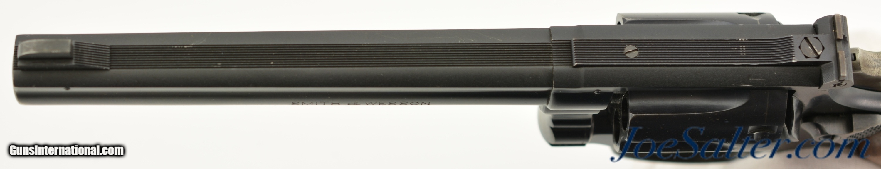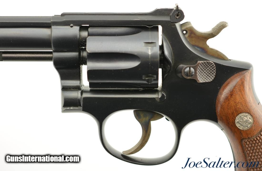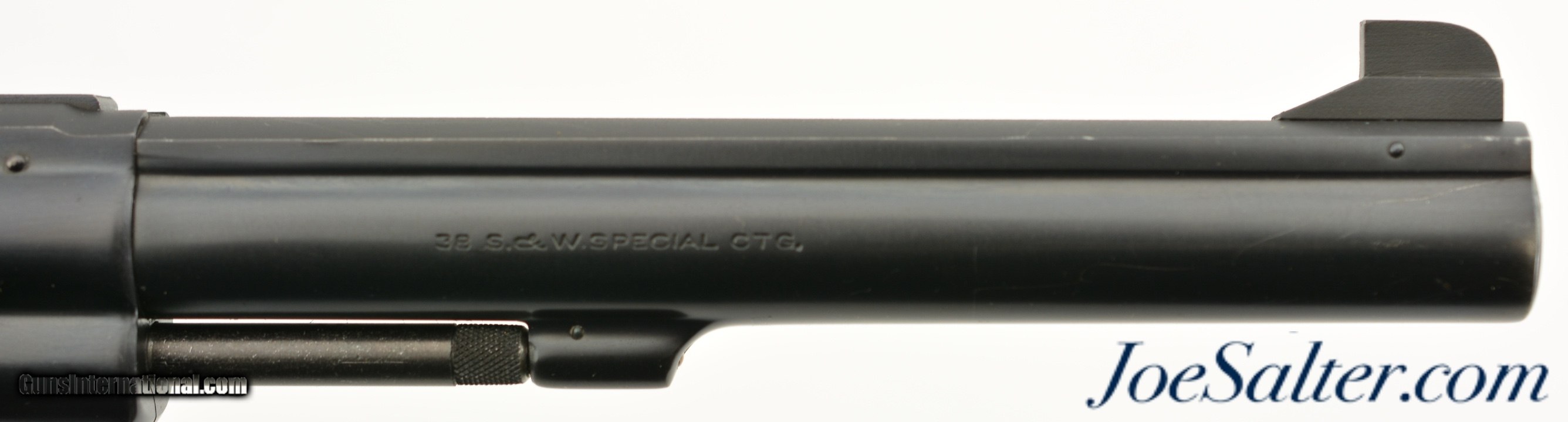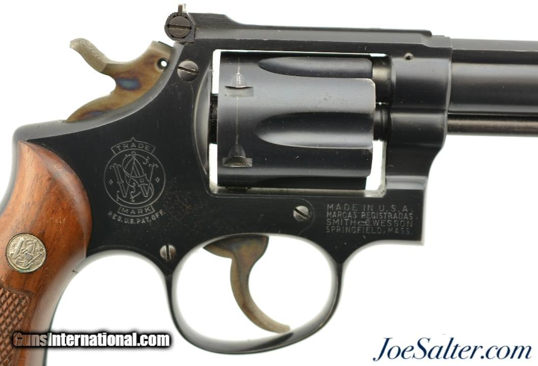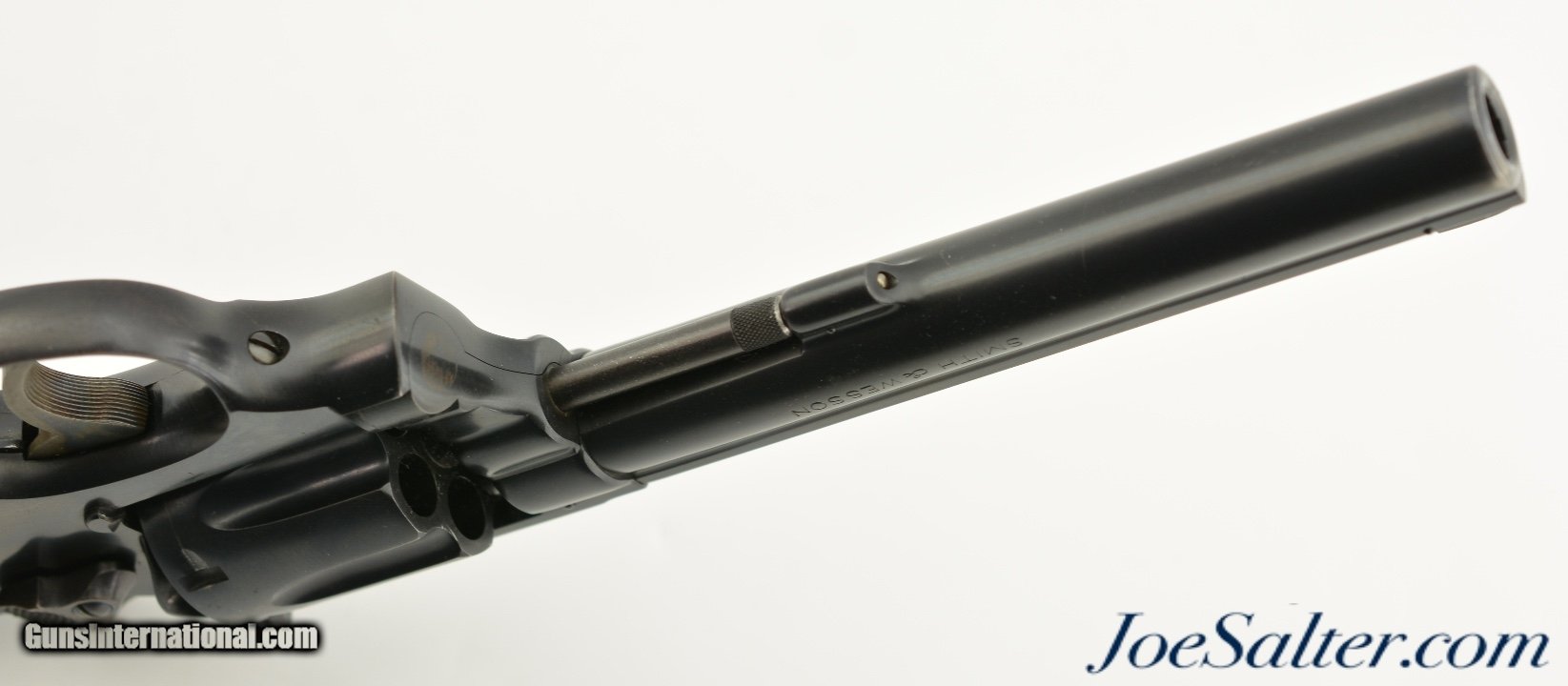Description: Serial #K93301, .38 Special, 6" barrel with an excellent, bright bore. This is an early 1950s revolver that has matching numbers on the frame, barrel, cylinder, yoke, and extractor. The metal retains 97-98% of the original blue, with some mild silvering along some of the high edges, a faint turn-ring on the cylinder, and a few specks of plum-brown flaking on the yoke hinge. The hammer and trigger have most of their original color case-hardening remaining, with some gray fading along the edges. The checkered, diamond-center grips are numbered to the gun on the interior, and are in good shape overall, although there are some small chips and peen marks at the butt. This is a fine example of a five-screw K-38, and would make a great addition to a collection. FFL or C&R SOLD Curio/Relic: Yes |