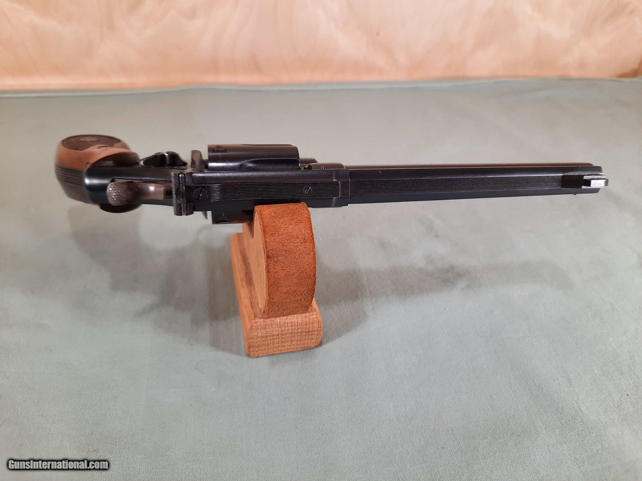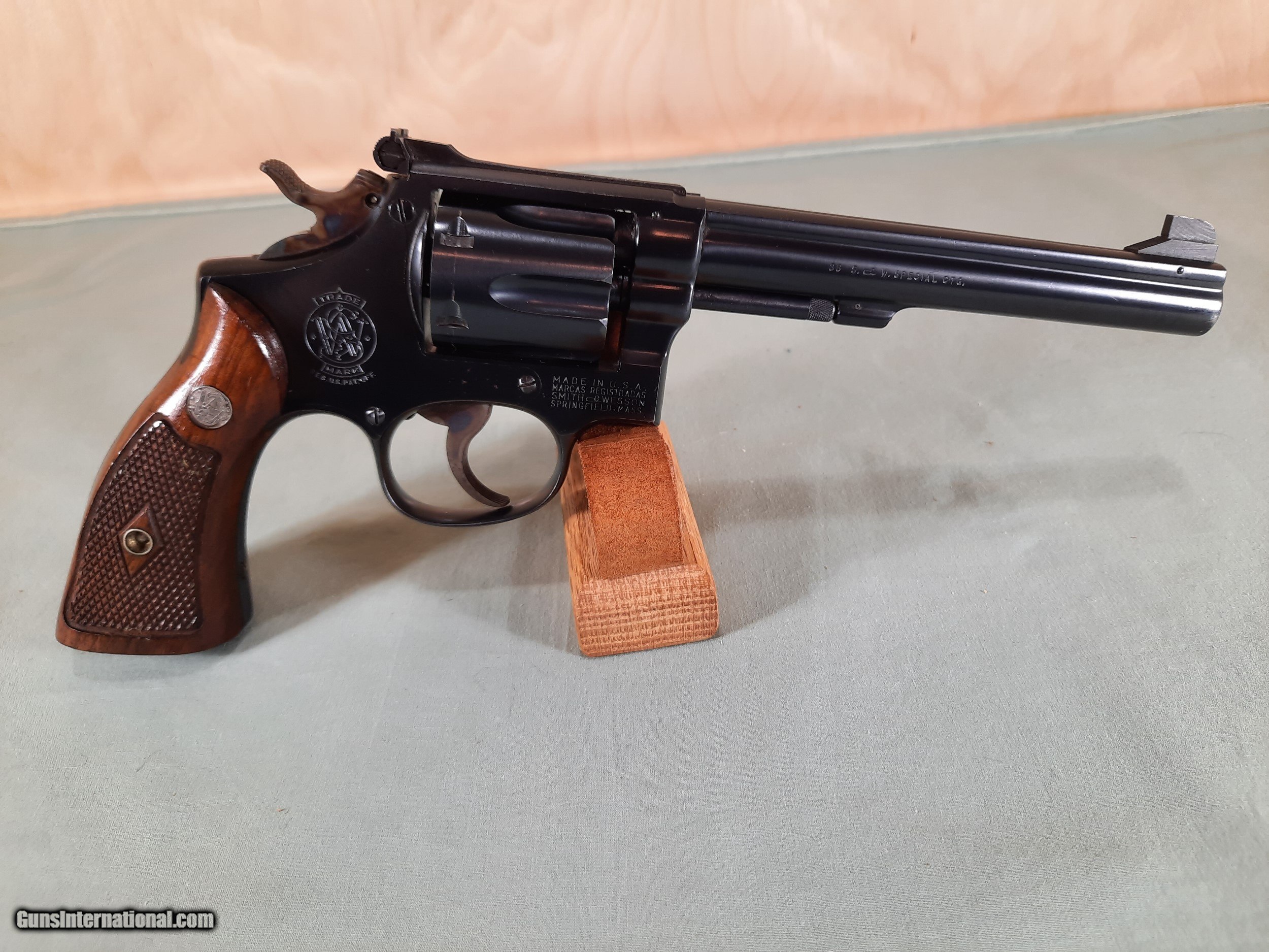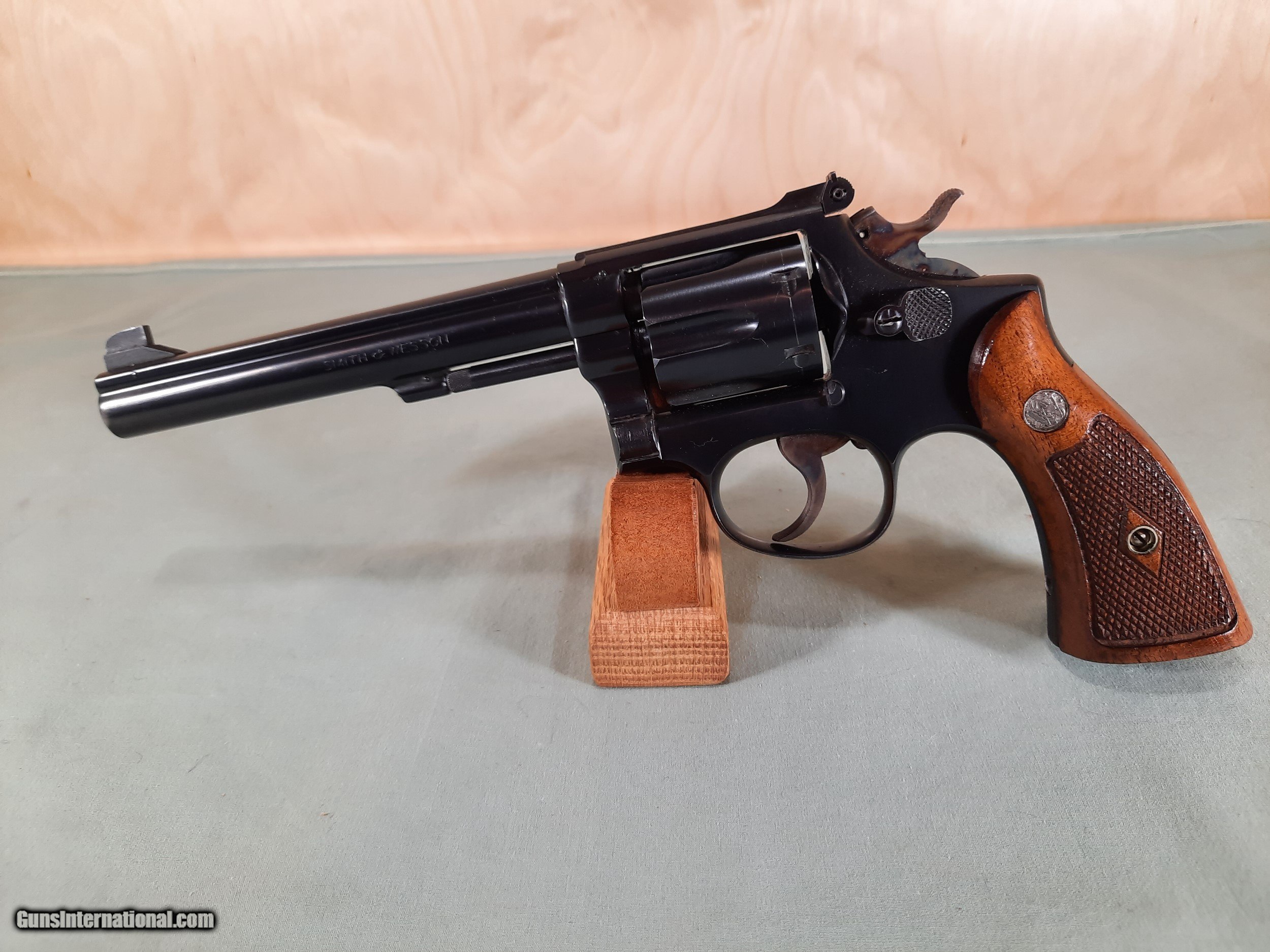 Description: This is a very nice excellent condition Smith & Wesson K38 38 special revolver with original diamond grips numbered to the revolver. The bluing is 95 percent plus and the grips have no gouges, marks or cracks. Slight cylinder turn mark and minimal edge wear at the muzzle. The bore and cylinder chambers are perfect.. No box, tools or papers. Serial Number K 7901X. This is a five screw revolver made in 1949. NO CALIFORNIA SALES SALE PENDING FUNDS 3/18/21 SOLD |