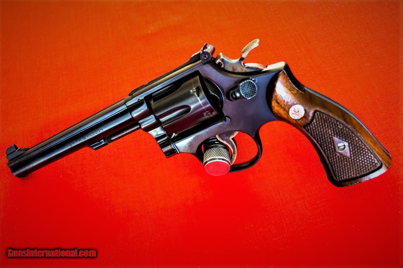 Description: 1951 Vintage Boxed 5-Screw Smith & Wesson K-38 Target Masterpiece Revolver*** ITEM DISCRIPTION: Here for /Sale-- This "Highly Sought and Desirable", 1951 Smith & Wesson, 5 screw K-38 Target Masterpiece, An original S&W box, 38spl., pinned 6 inch barrell, Double action revolver, still owned by the original family. Features: Built on a 5-screw Square Butt K-frame. Serial number K 138-613, manufactured in 1951, and sold to my father in 1954. He etched his name KLOSS H and date [95 4 NO] into the revolver's handle's frame. It has high gloss deep blue original finish with strong appealing case colors. A pinned 6 inch barrel with a wide full length top rib with 10 grooves, In true target configuration, A ramped a 1/8-inch Semi-Partridge front post, with an adjustable Micro-Click .146 black square notch rear sight. A grooved .265 target trigger with a checkered .375 target hammer. Matching to Gun's numbers. , A checkered Diamond Walnut stocks with silver S&W medallions. This item also comes complete with the originaL blue two piece box with the original label, A Hoppe's 38 caliber pistol cleaning kit, A leather Sheepskin lined carry bag, A 1950's K38 Revolver parts list with their cost. And from the ORIGINAL 1955 Smith & Wesson Advertisement from the "American Rifleman" magazine showing that in 1954 an American, Torsen Ullman, using a MODEL K-38 TARGET MASTERPIECE set a new world record score of 586 out of a possible 600 while winning the World Championship in Caracas Venazuala, the gun's only Special Feature was to change the grips to custom made stocks with a thumb rest. These are similar to the plastic target ones included in this . GUNS CONDITION: I would actually say "EXELLENT!!, PLEASE SEE ALL THE PICTUERES". SOLD Handgun Caliber: .38 Special Manufacturer: SMITH & WESSON Model: K38 Serial Number: K138-613 Barrel Length: 6 inch Condition: EXELLENT Metal Condition: EXELLENT Wood Condition: EXELLENT Bore Condition: EXELLENT Barrels: PINNED Barrel Type: 6 INCH Action: DOUBLE Triggers: GROOVED TARGET .265 Rib: 1/4 inch wide with 10 grooves Finish: BLUED Sights: ADJUSTABLE MICRO-CLICK .146 BLACK SQUARE NOTCH BACK, SEM-I PARTRIDCH FRONTT Manufacture Date: 01/1951 Case: ORIGINAL BLUE BOX, AND LEATHER/SHEEPSKIN CARRY BAG Item Location: PALM DESERT, CA |