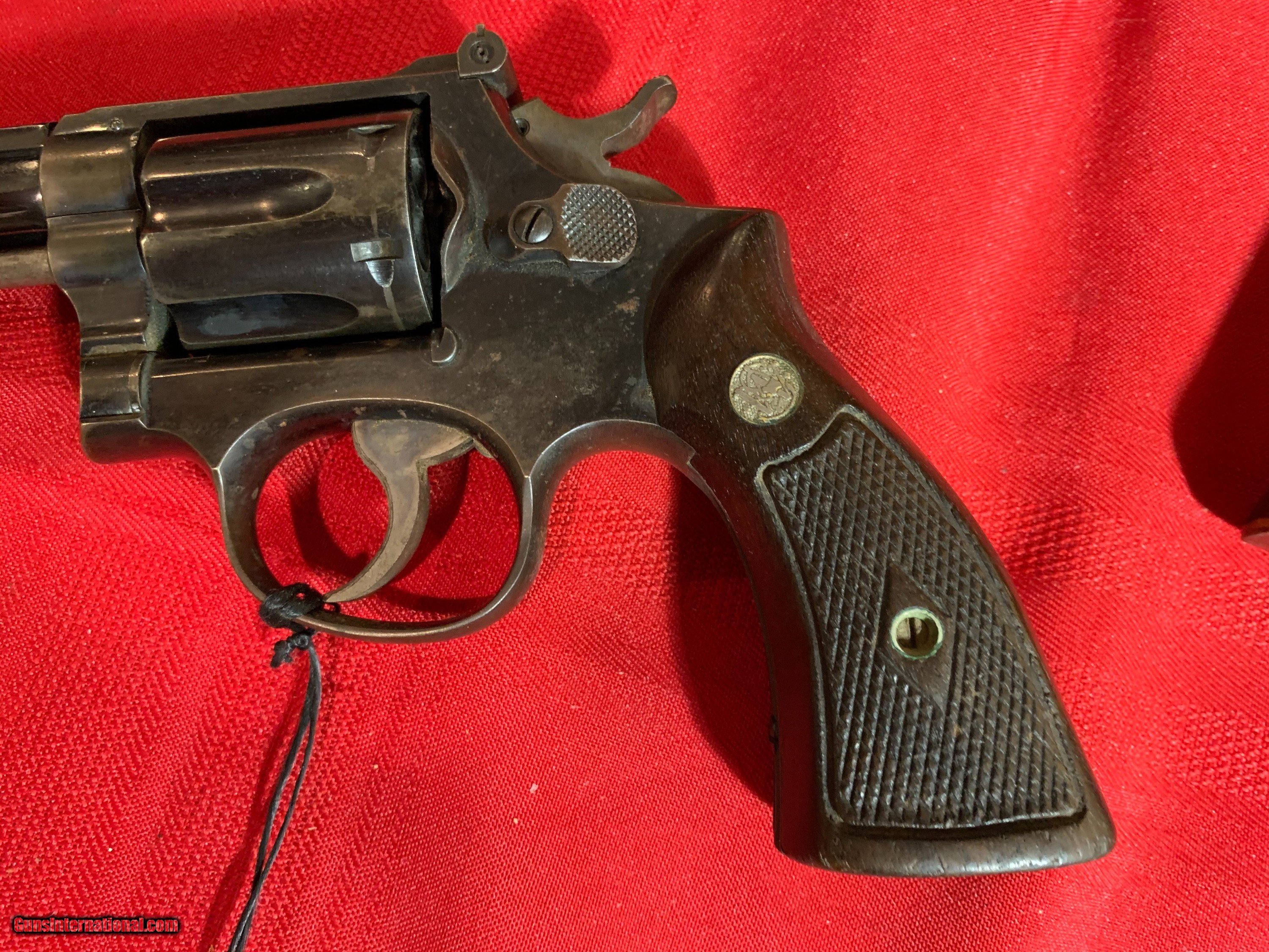 Description: 1956 gun rebarreled in 1984 8 3/8". 4 screw. Original grips. Tight with smooth double action. S&W holster dated 1984 SOLD Curio/Relic: Yes Handgun Caliber: .38 Special |