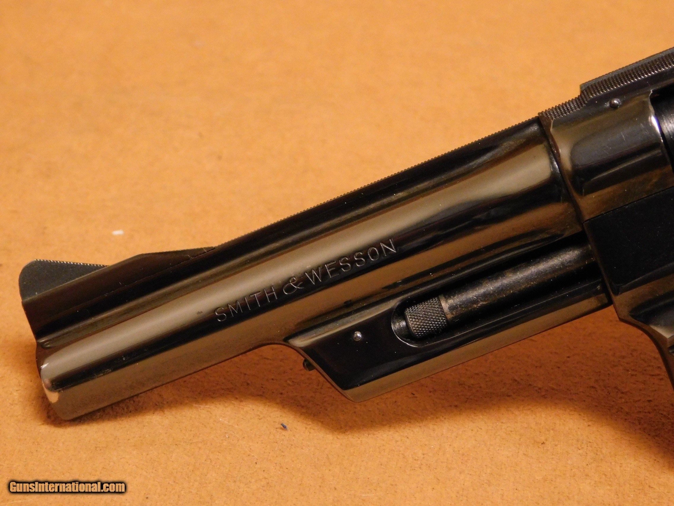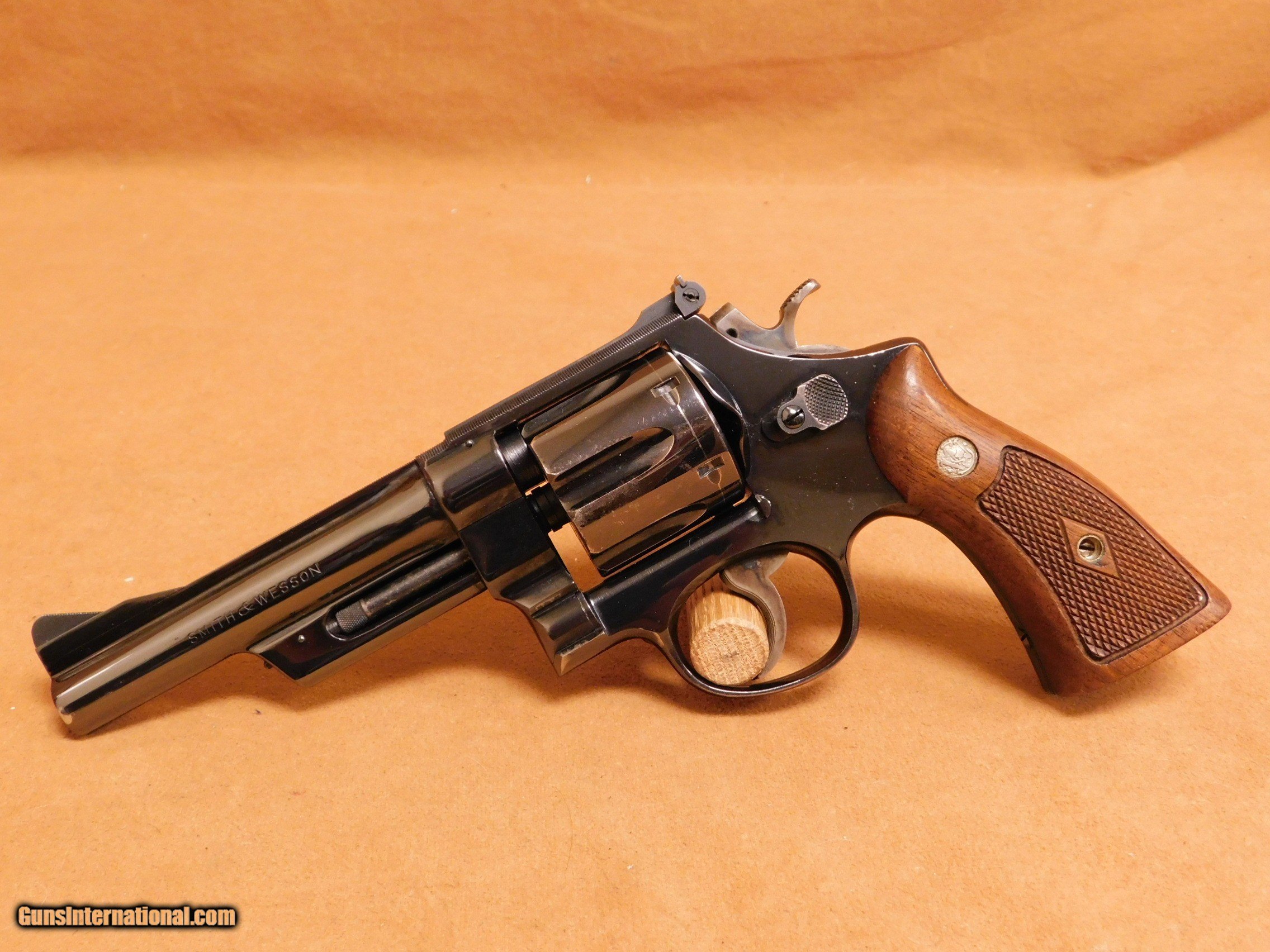 Description: This is a very nice Smith & Wesson Pre-Model 27. It is a five-screw target N-frame gun with a 5-inch barrel. Production began in 1950 with the "S" serial prefix (at S75000). In 1956, the upper sideplate screw was deleted around serial umber S172000. This gun falls in between, thereby qualifying as a C&R item. This gun is equipped with diamond walnut stocks, adjustable black rear sights, and a black ramp front. There is some wear near the crane, muzzle, right-hand side of the frame, and on the cylinder. There is some pitting from rust that has since been cleaned. It no longer has its box. Despite this, this gun is in very, very nice shape. All items are also available for sale in our brick & mortar store and are subject to prior sale. Think long, think wrong. Payment On firearms, we typically only accept credit cards or money orders/cashier's checks.