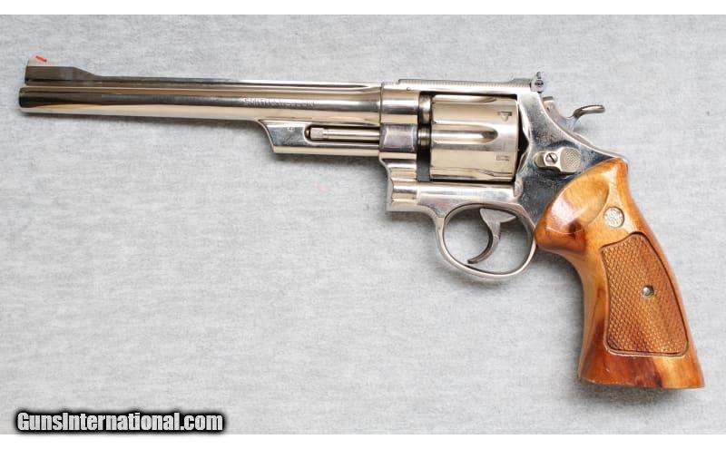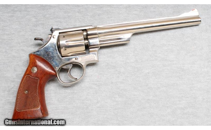 Description: Excellent condition, light finish wear. S&W Large frame nickel finish 6 shot magnum revolver with 8 3/8" pinned barrel, shrouded ejector, and adjustable sights. Wide target trigger and checkered hammer, S&W factory wood target grips. Manufactured in 1956 and 1957. .357 Mag SOLD Curio/Relic: Yes Chambers: Revolver Metal Condition: Excellent Wood Condition: Grips are excellent Bore Condition: Bright Barrels: 8 3/8 Triggers: Double and single action Butt Pad: Wood grips Sights: Adjustable Item Location: La Vista, NE |