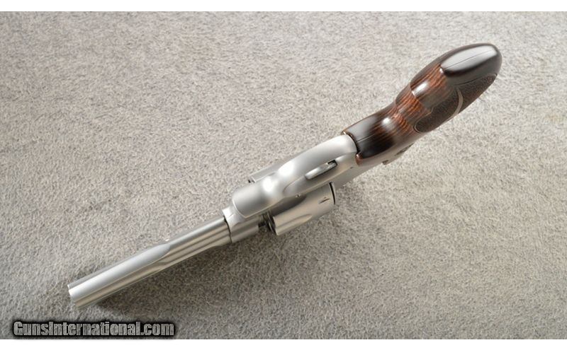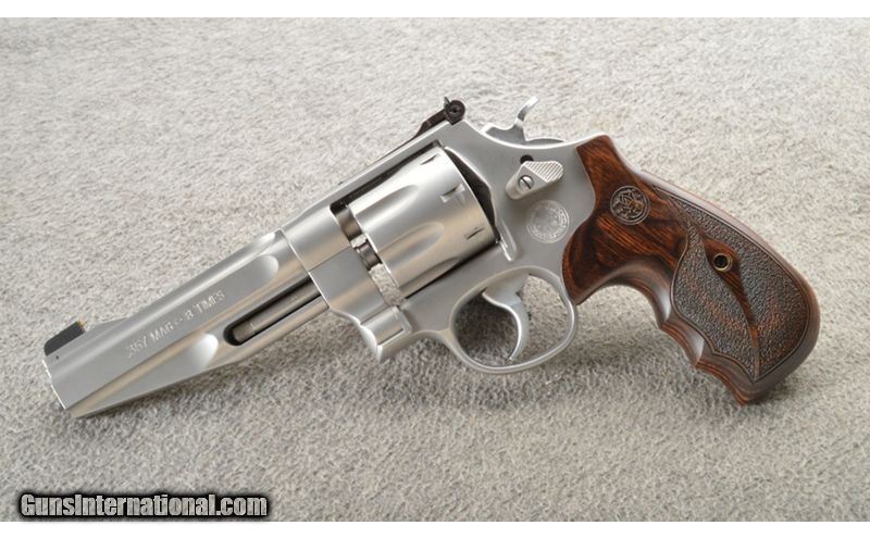 Description: Completing the line between main production and the Performance Center, the Smith & Wesson Pro Series represents the next step from standard models. These firearms are offered with a variety of enhancements yet still remain true to "stock." Bringing competition specifications and features to factory models, the Pro Series offer that ready-to-go package while still maintaining production line integrity. • Chamfered Charge Holes • Custom Barrel with Recessed Precision Crown • Bossed Mainspring • Cylinder cut for moon clips (Moon Clips Included) A moon clip is a ring-shaped or star-shaped piece of metal designed to hold multiple cartridges together as a unit for simultaneous insertion and extraction from a revolver cylinder. .357 Magnum SOLD Chambers: 8 Sot revolver. Metal Condition: Excellent matte silver finish. Wood Condition: New rosewood grips. Bore Condition: Strong and bright. Barrels: 5" Stainless steel barrel. Triggers: Single (DA/SA). Weight: 2.75 lbs Sights: "Front blade, adjustable rear. Item Location: Owatonna, MN |