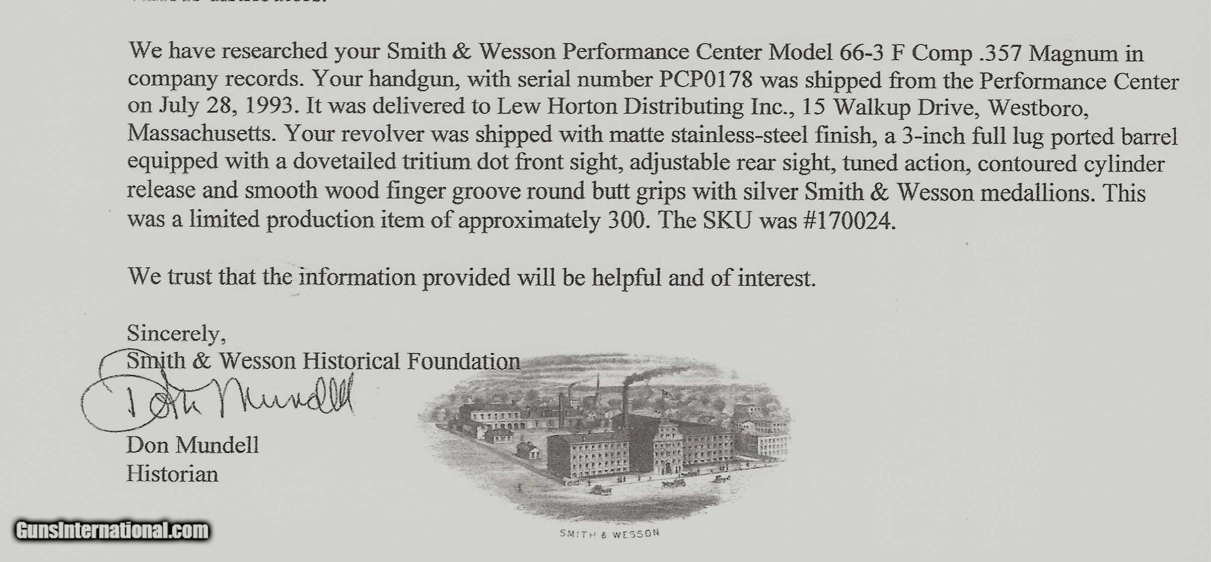 Description: Smith & Wesson Model 66-3 Performance Center “F-Comp” .357 Magnum, Pre-Lock 3-inch Ported “K” Frame Product Code 170024 Early Lew Horton, 1993 One of 300 This is for my Smith & Wesson Model 66-3 Performance Center Revolver, Pre-Lock, .357 Magnum, Round Butt “K” frame. It is from my collection which I continue to downsize. Per the “Smith & Wesson Historical Foundation” letter this particular revolver was produced in 1993 and shipped to Lew Horton. This is the First run of these “F-Comp”, 66-3 Revolvers in 1993. This Model 66-3 Performance Center, Pre-Lock is in Excellent Condition. I have been a S&W early PC collector for some time, and this the last and nicest “F-Comp” that I have owned. This gun was made when the Performance Center was truly a Custom Shop that produced Quality guns. Features exhibited by this Model 66 -3 Performance Center in .357 Magnum: - Pre-Lock “K” Stainless Frame Round Butt - 3-inch Barrel, Factory Ported Barrel - Double and Single action with adjustable sights - Early Limited Production, one of 300 - Factory Finger Groove Combat Grips - Excellent Condition with Original Box and LabelThis is a vintage firearm that shows handling and usage marks. Payment can only be made by United States Postal Service (USPS) Money Orders or Personal Checks, which will be held until cleared. Payment is to be made within 7 days of end of . Please Note: This Smith & Wesson Model 66 -3 Performance Center is being sold on a “AS IS” basis with No Return. Per Guns International this No Return must be agreed upon by Buyer and Seller. I am a private collector and do NOT have an FFL. Generally, it is more reasonable to ship through my FFL even with the FFL fee of $30.00, Plus actual shipping/mailing costs. This would typically be by FedEx (2 day). I would also be pleased to ship to your FFL direct but regulations require shipment by common carrier, Overnight. In either case, I must have a signed copy of your FFL before I can ship. If you are a legal Florida resident, we may be able to arrange a face-to-face transfer. Please know if you are legally able to own this firearm before . Sorry, no sales to California. Thanks. SOLD Handgun Caliber: .357 Magnum Manufacturer: Smith & Wesson Performance Center Model: 66-3 Barrel Length: 3-incg Condition: Excellent Metal Condition: Excellent Wood Condition: Excellent Bore Condition: Excellent Finish: Stainless Steel Sights: Adjustable Manufacture Date: 1993 Extras: Factory Label & PC Box |