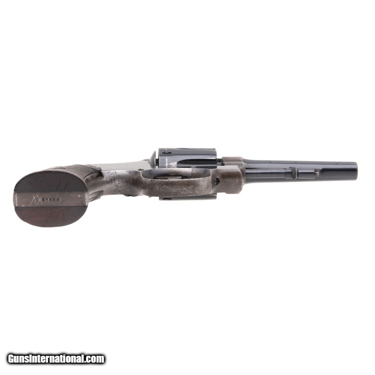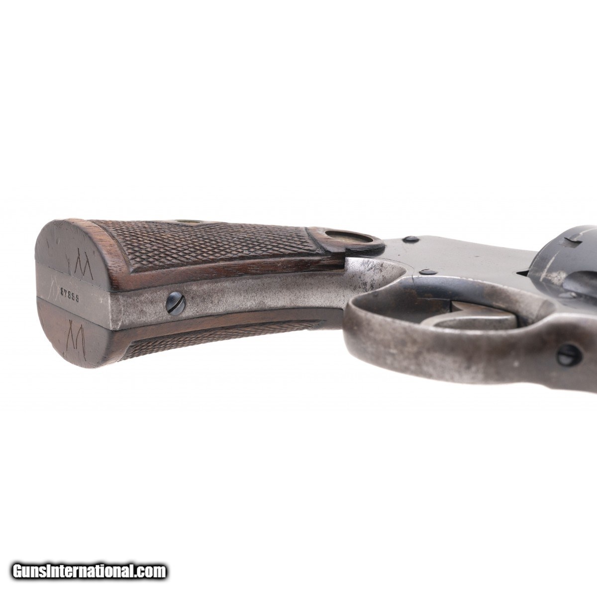 Description: "Serial No. 87899, circa 1920's, .32 W.C.F., 4"" round barrel. 55% dull blue remains, expected loss due to holster and handling wear is visible. Serial numbers are matching, bore is good with light frosting visible in the grooves, rifling remains strong. Brown checkered grips show light wear, mostly on the bottom with the initials ""W"" carved in. Action indexes correctly with a tight lock up. SOLD Curio/Relic: Yes |