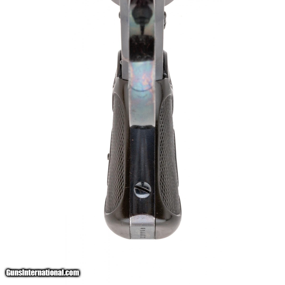 Description: " Serial No. 117752, circa 1902-1909, .32 S&W, 3"" round barrel. Majority of blue remains with the cylinder and trigger guard starting to turn to a plum patina. Bore is bright and shiny with strong rifling. Brown checkered grips are near excellent condition. Action indexes correctly with a tight lock up. Consignment SOLD Curio/Relic: Yes |